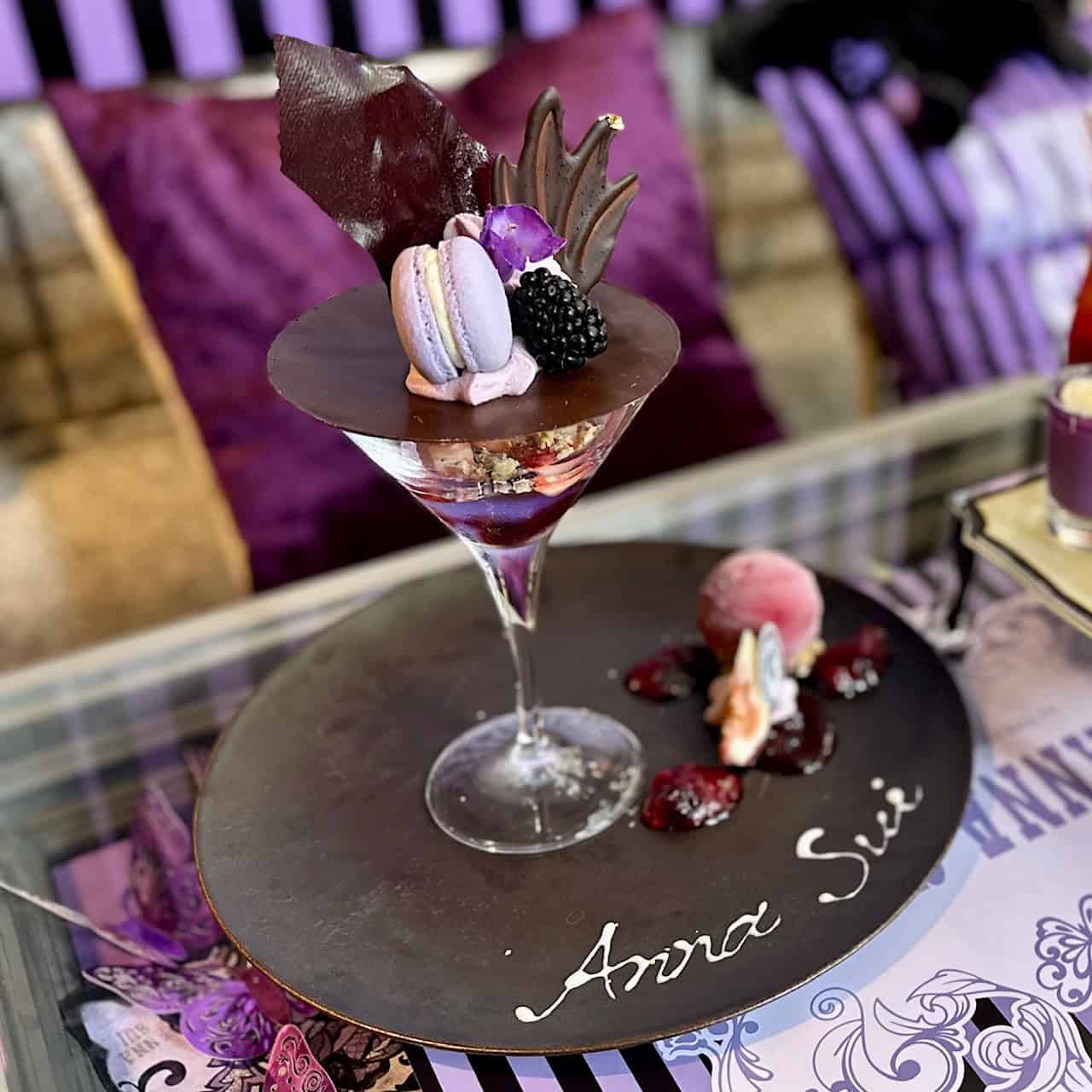 ANNA SUIの世界観を一皿で表現したパフェも登場!カシスソースにバイオレットカラーのゼリーを重ね、洋梨といちごをトッピングし、クランブルのザクザク食感をアクセントにした爽やかなテイスト。トップはチョコレートでふたをして、ANNA SUIパープルをイメージしたマカロンと蝶の羽のようなカシスチュイルで飾っています。下に添えてあるカシスシャーベットもさっぱりとしたテイストで美味しい。