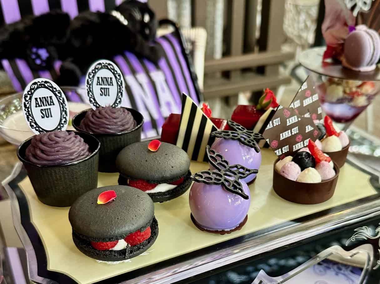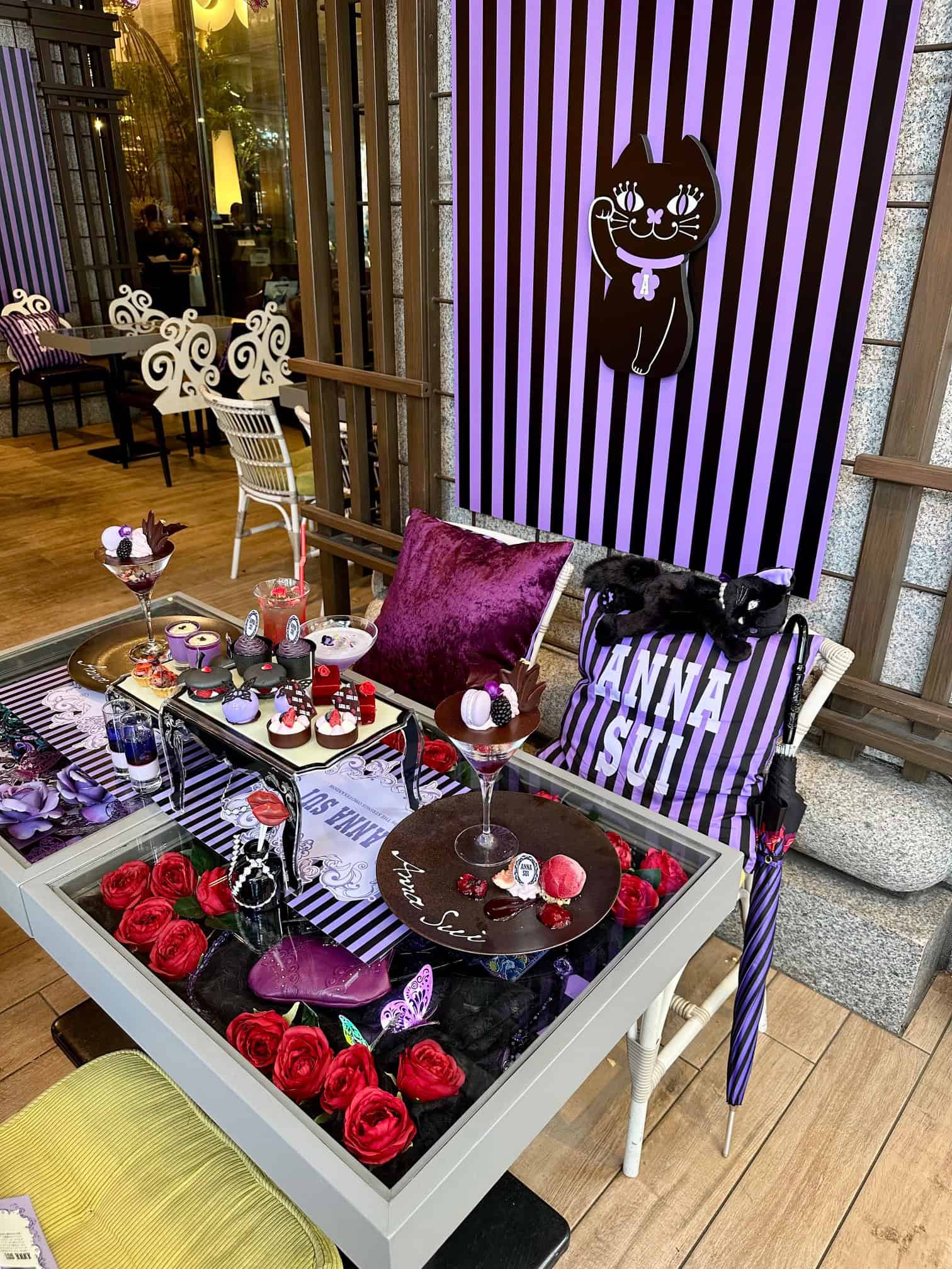イベント期間中、テラス席はコラボレーションスペシャルデコレーションに変身!ANNA SUIのブランドロゴをあしらったアートやクッション、蝶のモチーフをイメージした華やかな装飾が空間を彩り、ANNA SUIの世界観に包まれながらティータイムを過ごすことができます。