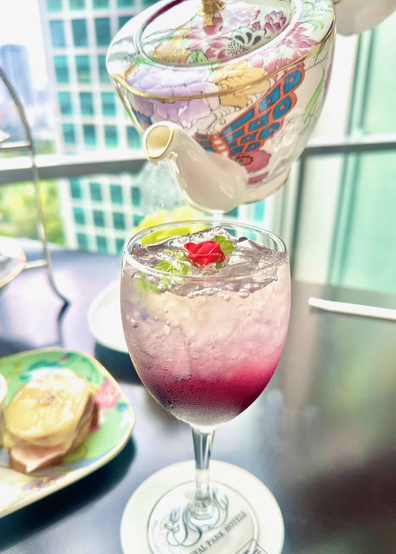バタフライピーシロップにSIROCCO TEAのジンジャーレモンドリームとフレッシュレモンジュースをブレンドしたアイスティーを目の前で注ぎ入れ、美しい2層のセパレートティーを作ってくれる平日サービス。ゆっくりとかき混ぜてから召し上がれ♪