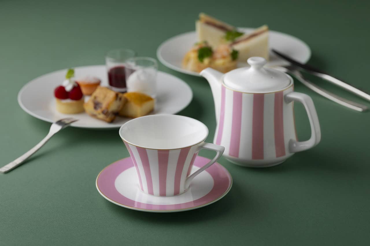 特筆すべきはこのアフタヌーンティーのために製作されたオリジナルのテーブルウェア。東京ステーションホテルのロビーラウンジで長く愛用されている「NARUMI」のオリジナルウェアのミントブルーに代わり、モーヴピンクが登場します。高品質な日本のテーブルウェアブランドとして世界からも支持の高い「NARUMI」のボーンチャイナ製のカップ&ソーサー、ポット、プレートに加え、3段のスタンドもすべてモーヴピンクで揃えました。非日常を感じる優雅で気品ある空間で楽しむスペシャルなアフタヌーンティーは予約必須です。