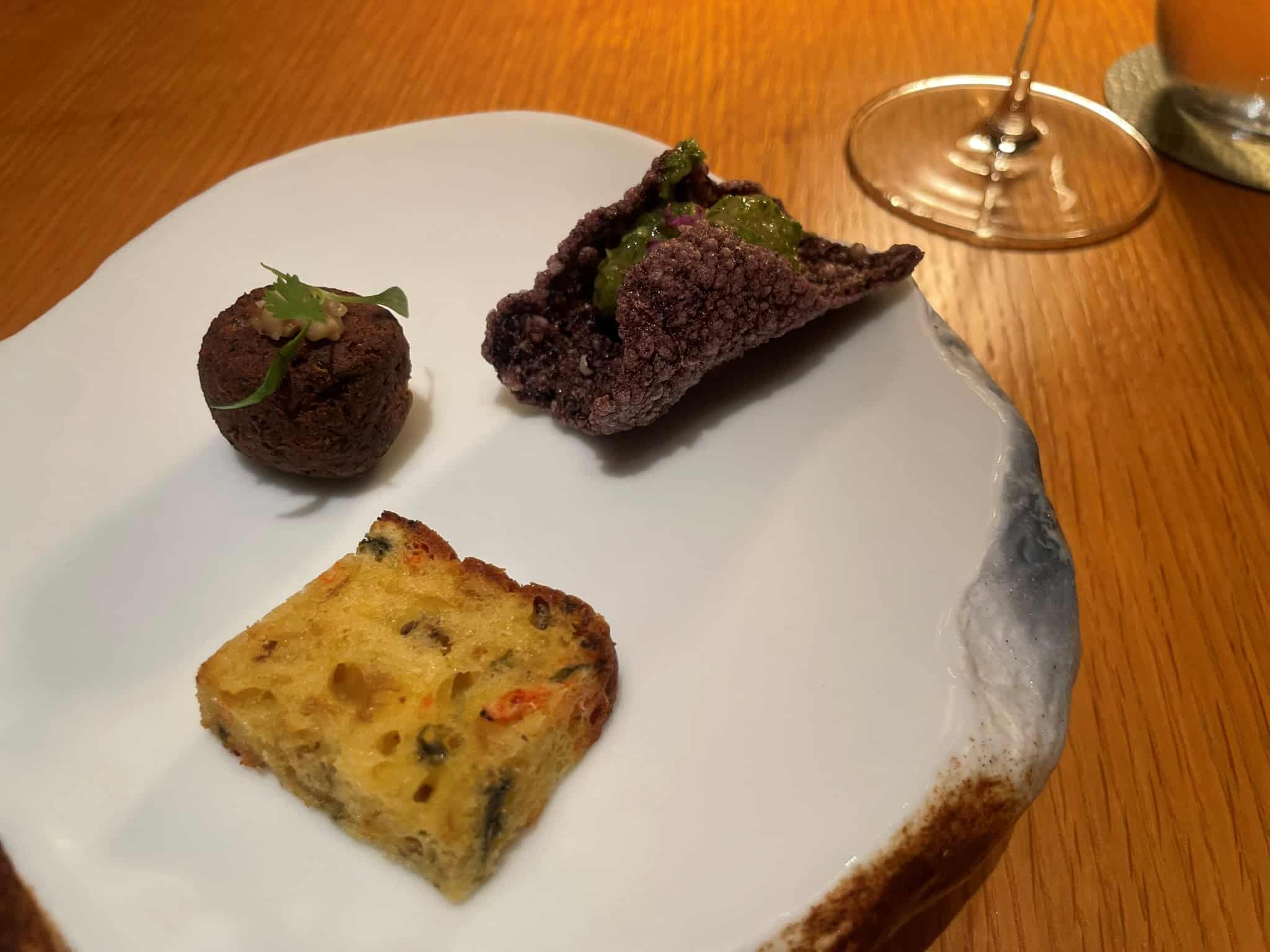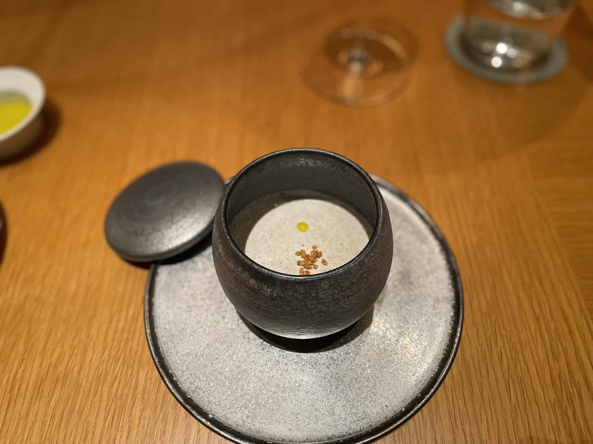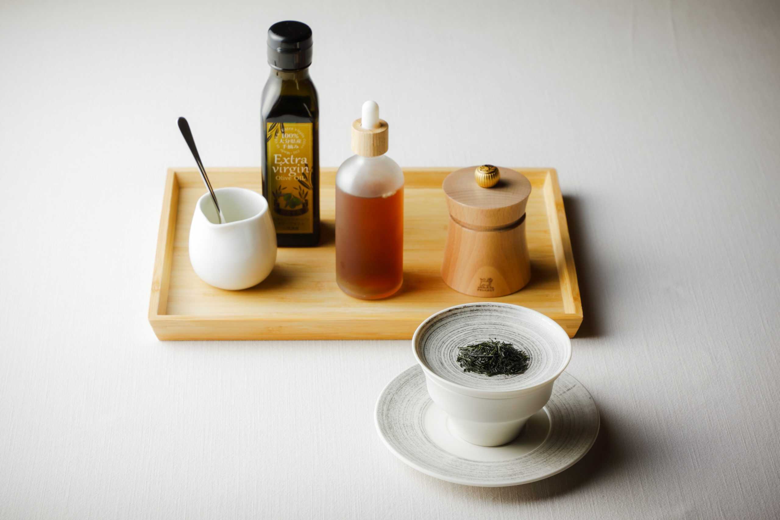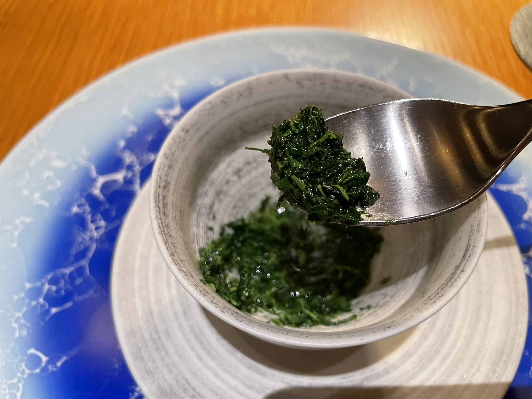 最初の一皿目にまず驚かされます。八女伝統本玉露の茶葉を鮎魚礁や福岡産かき酢、オリーブオイルで味変しながらいただくのですが、初めての茶葉を食すという驚き以上に茶葉の美味しさに衝撃を受けます。その後も続く、九州産の素材が想像を越える様々な形で表現されたお料理に、ずっとワクワクさせられる“食べるアート”のようでした。