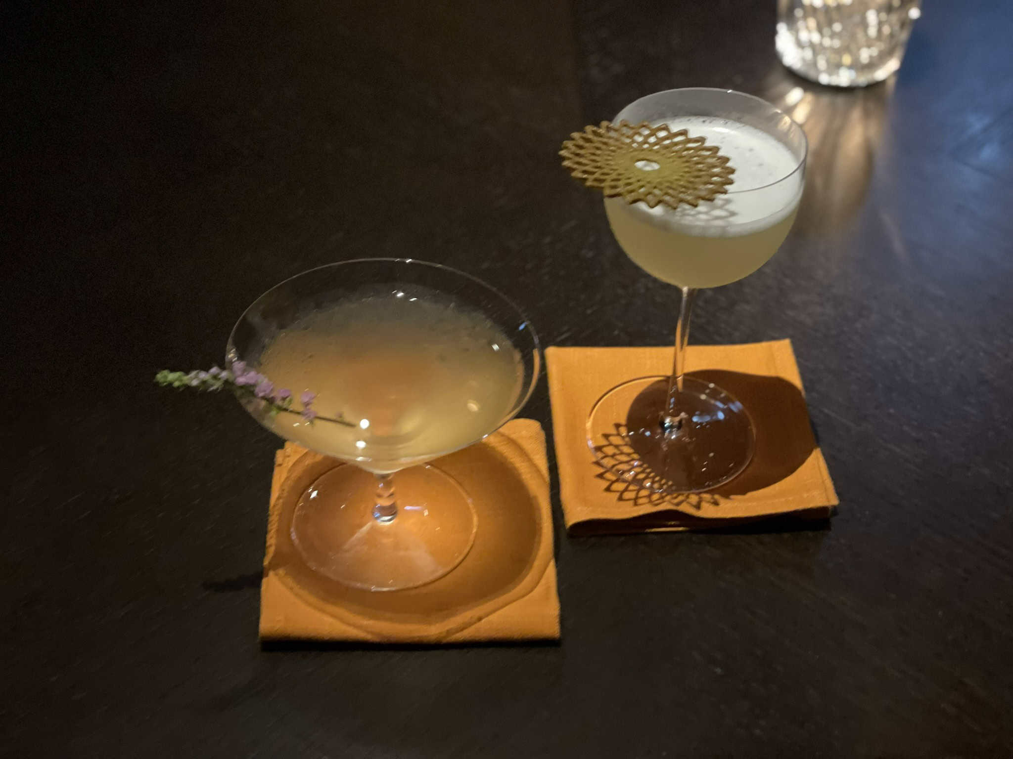 是非飲んで頂きたいのは博多名物を生かしたシグニチャーカクテル「明太マティーニ」(写真左、2,400円)。マンサニージャやウォッカ、焼酎に明太子を漬けこみ、さらに白ワインに漬けた昆布、トマトウォーター、明太子を合わせて1日濾して作るというかなり、手間も時間もかかるカクテルです。明太子好きな私はもちろんいただきました!