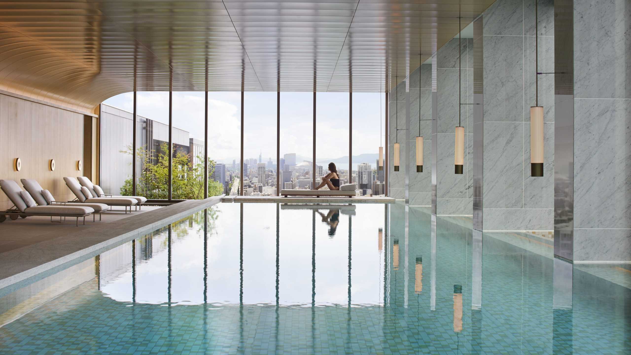 博多湾を望むプールに、ジャグジーやサウナを備えた空間は、まさに“天空の癒し”。