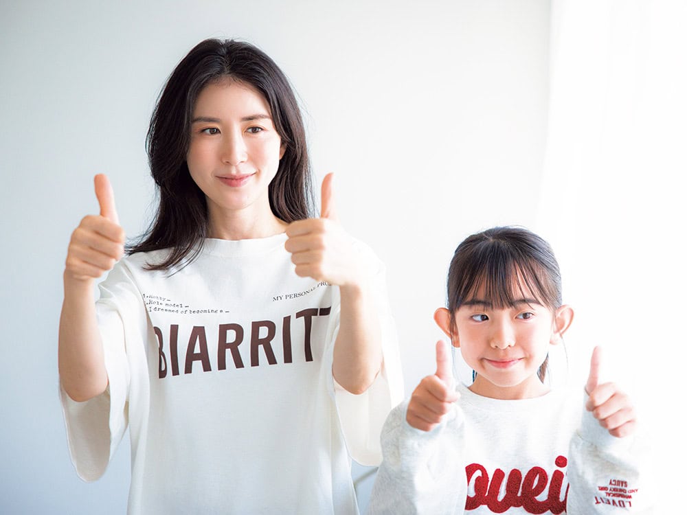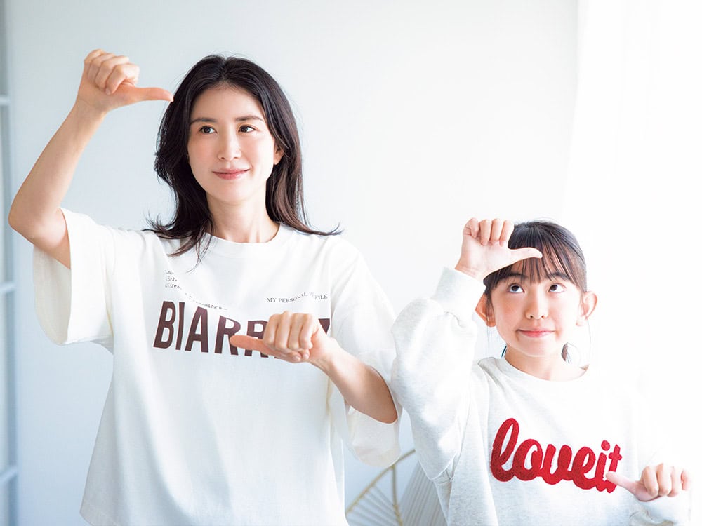 〈母〉カットソー¥11,000〈アッパーハイツ〉デニムパンツ¥25,300〈レッドカード トーキョー〉(ともにゲストリスト)〈子〉スウェット¥5,400(バイ ラビット/ナルミヤ・インターナショナル)