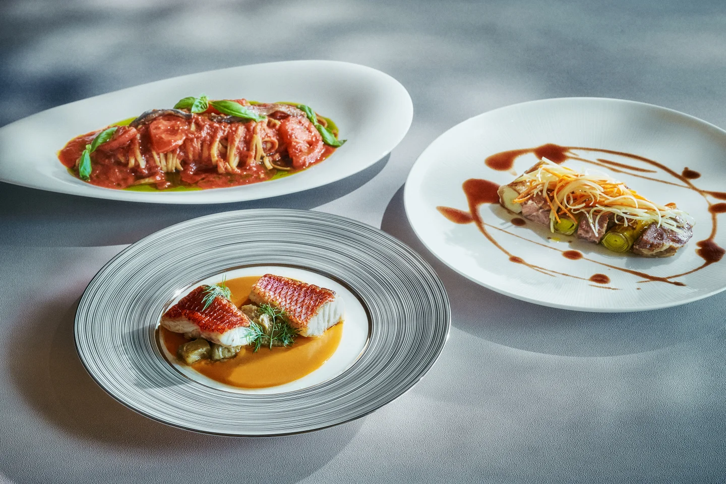 メインディッシュには、スペインを代表する美味、イベリコ豚のロースト。さらに、美しい海沿いの街サン・セバスティアンで愛される魚料理や、太陽と海の恵みをイメージしたトマトとアンチョビのパスタなど、現地ホテルでも人気の3品が揃います。ヘルシーでありながら満足感のある一皿一皿は、女子会ランチや、自分へのご褒美ランチにぴったり。