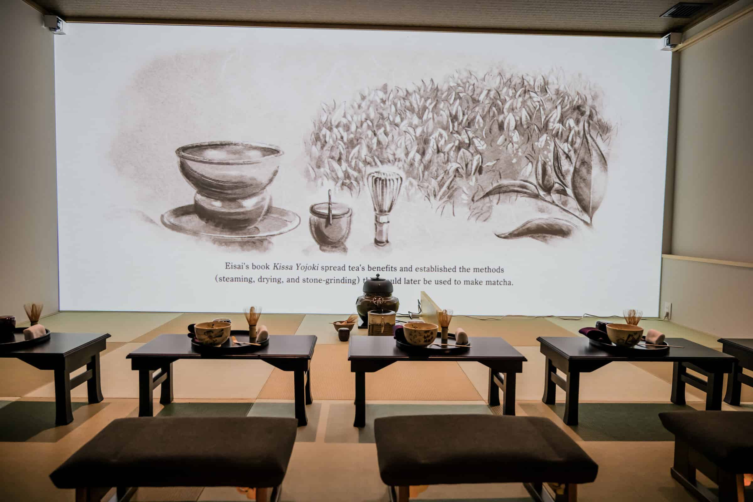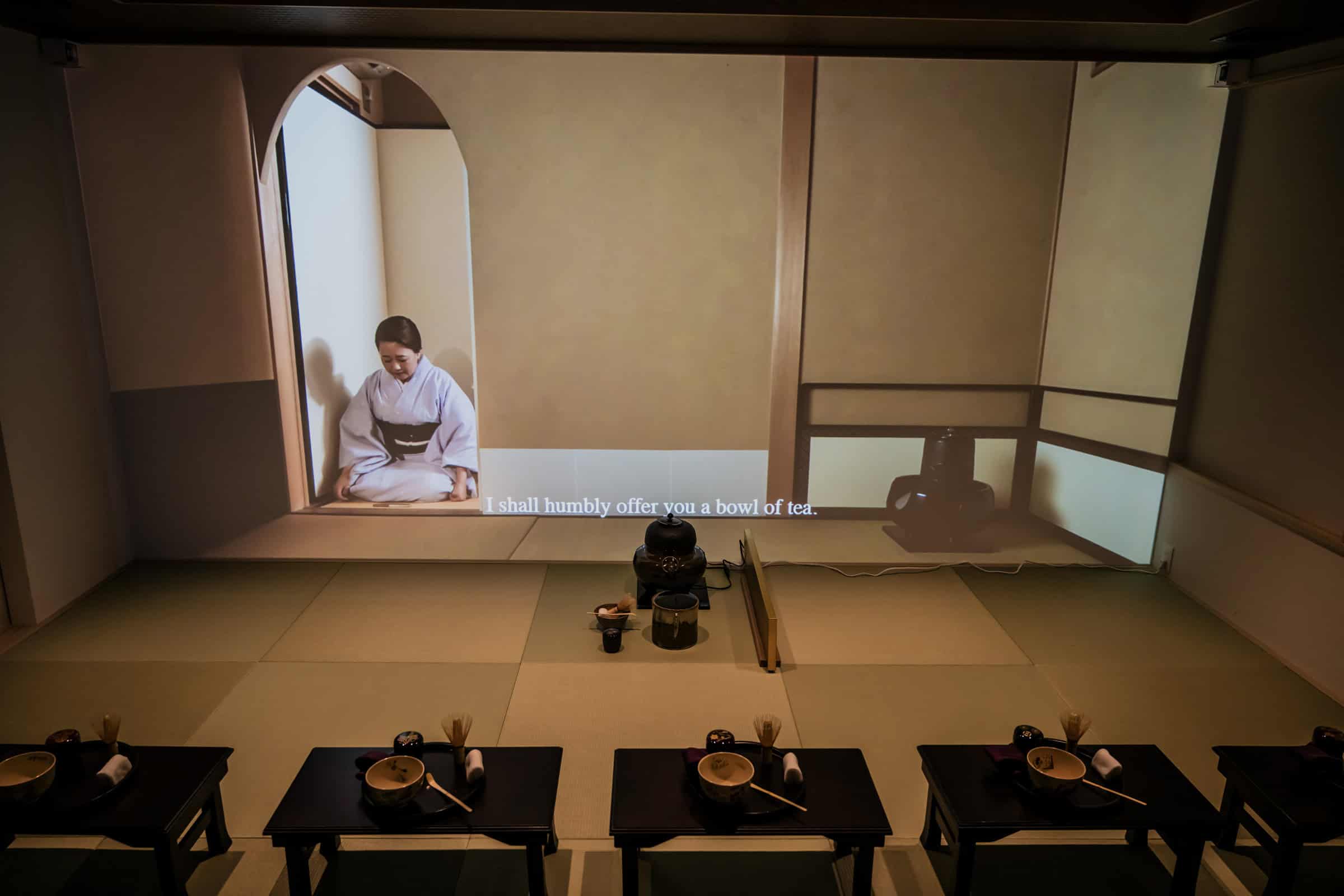 この茶室が「デジタル茶室」と名付けられるのは、部屋に溶け込んで設計された目の前の大スクリーンに