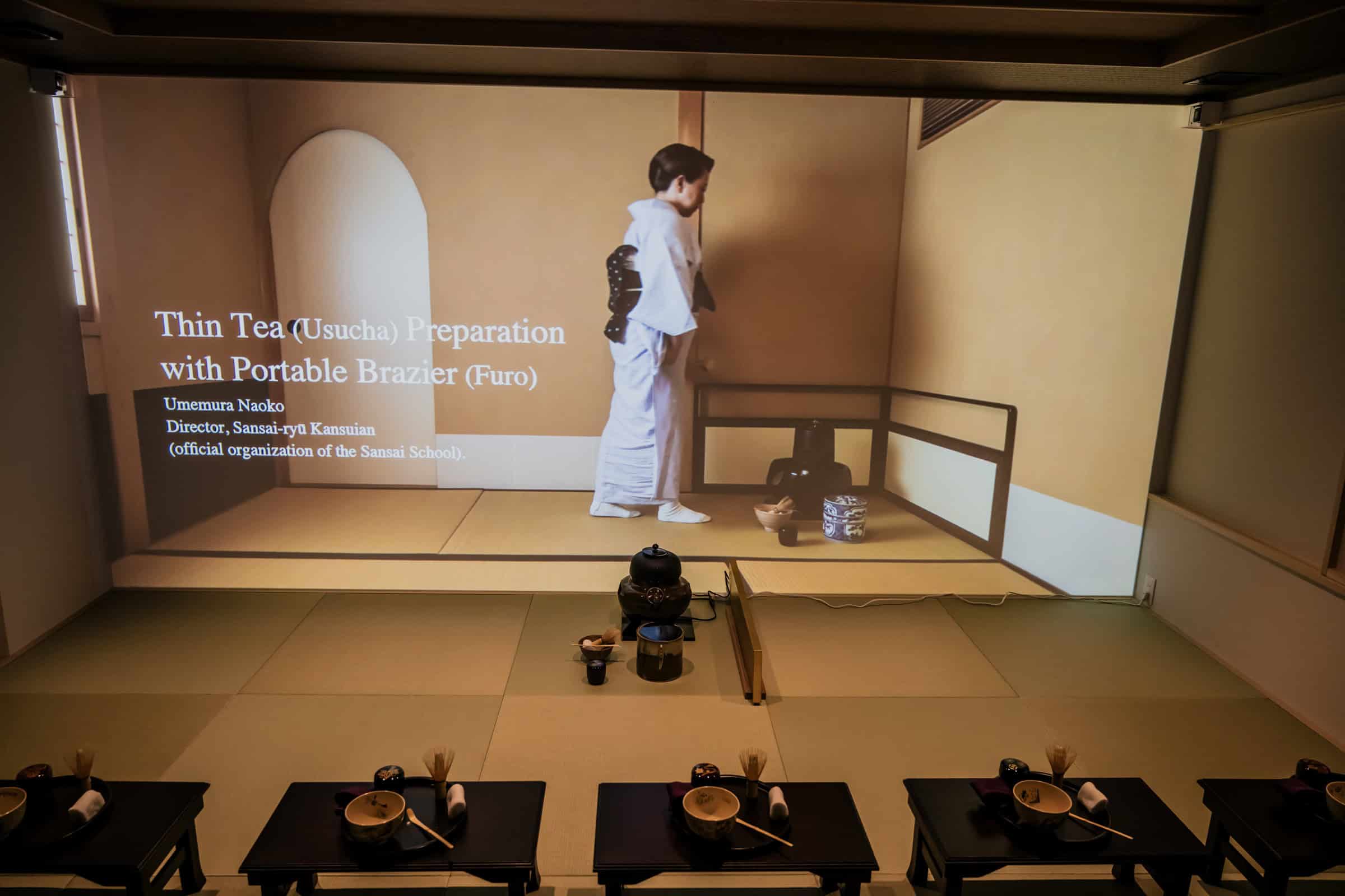 ほぼ等身大の梅村先生が写し出され、一からお茶のたて方を同様に丁寧に教えてくださるのです。