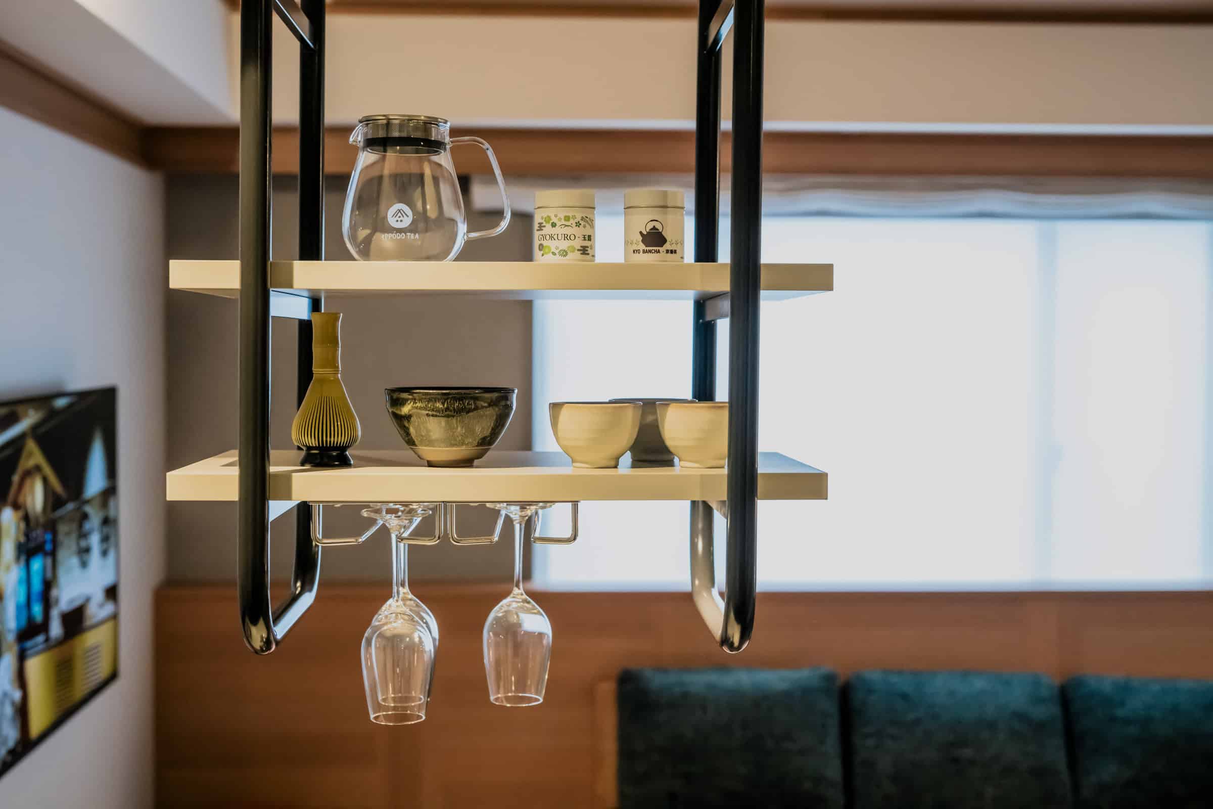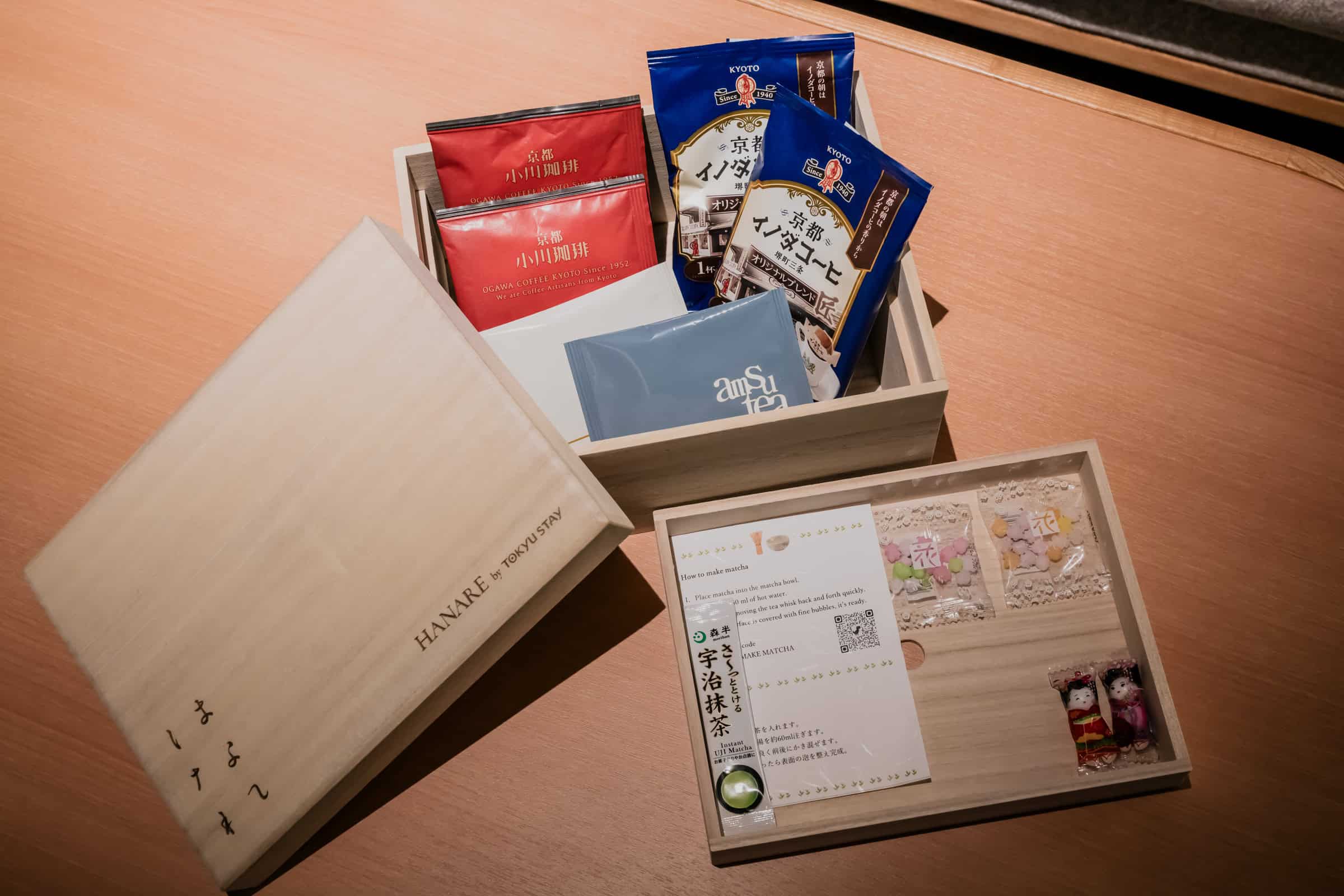 部屋でも京都の老舗コーヒー店の味が楽しめるよう、「小川珈琲」や「イノダコーヒー」、ドリップケトルや味わいのあるカップが置かれる心配りが。老舗の京菓子店「伊藤軒」のお菓子も嬉しい。