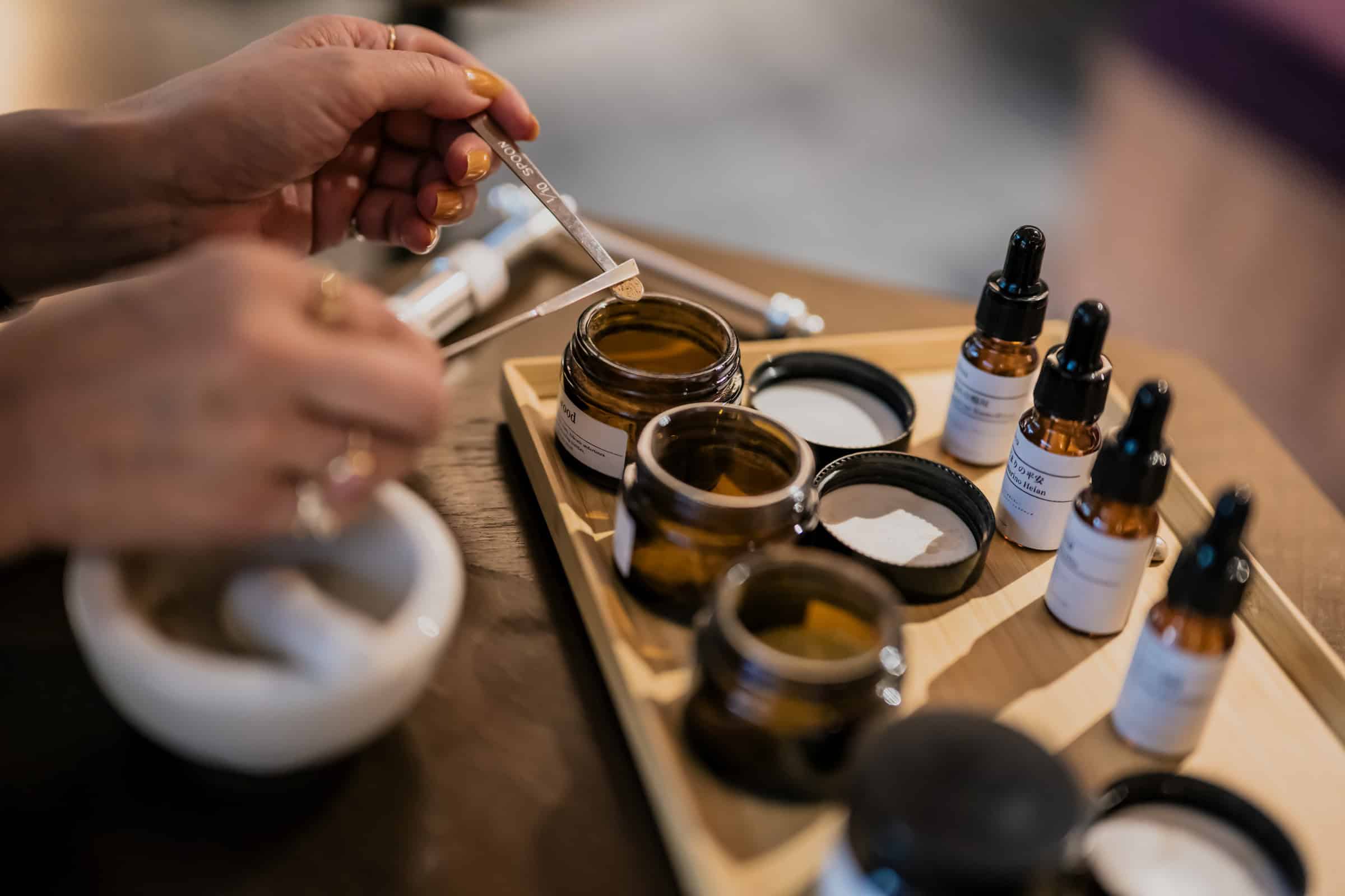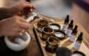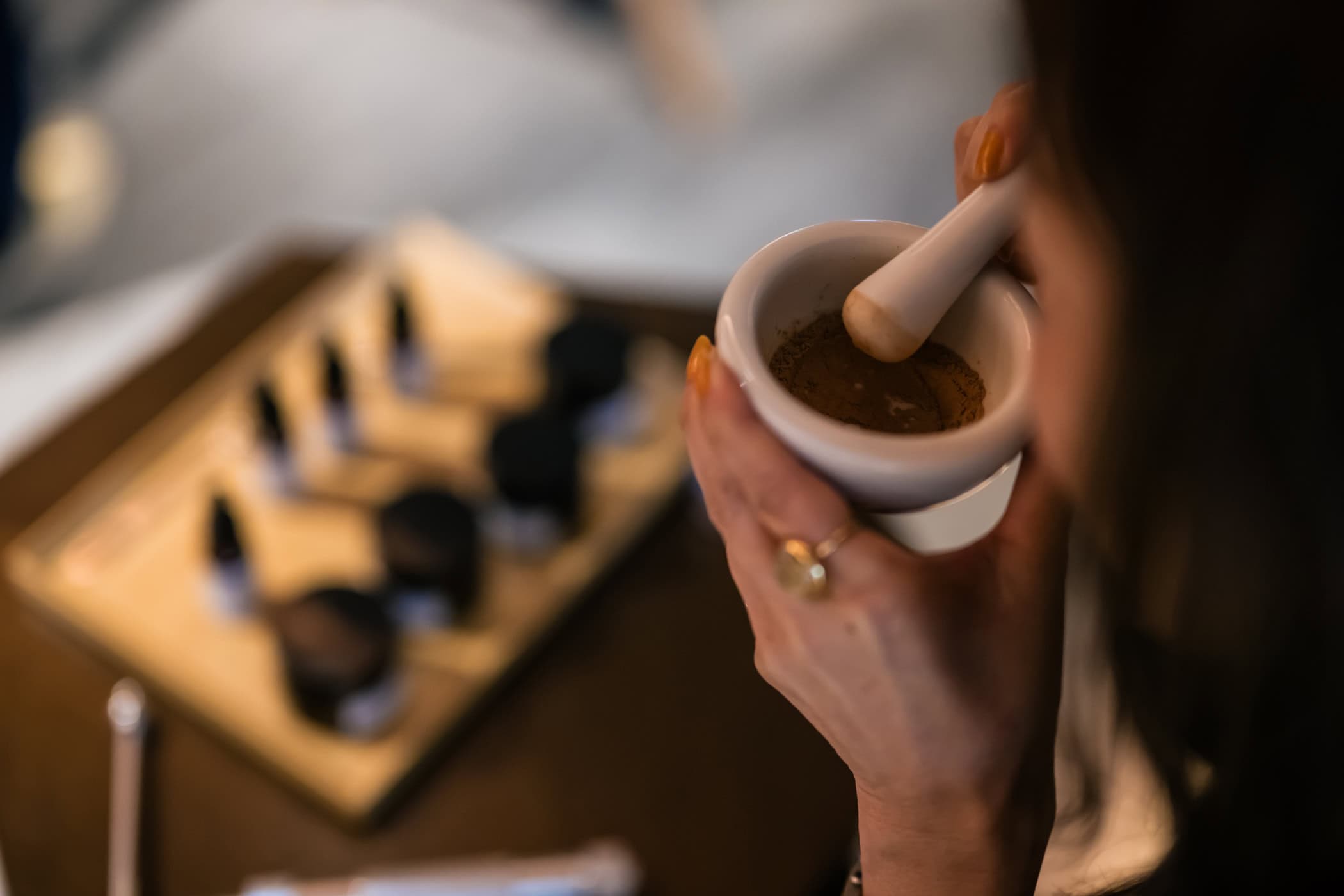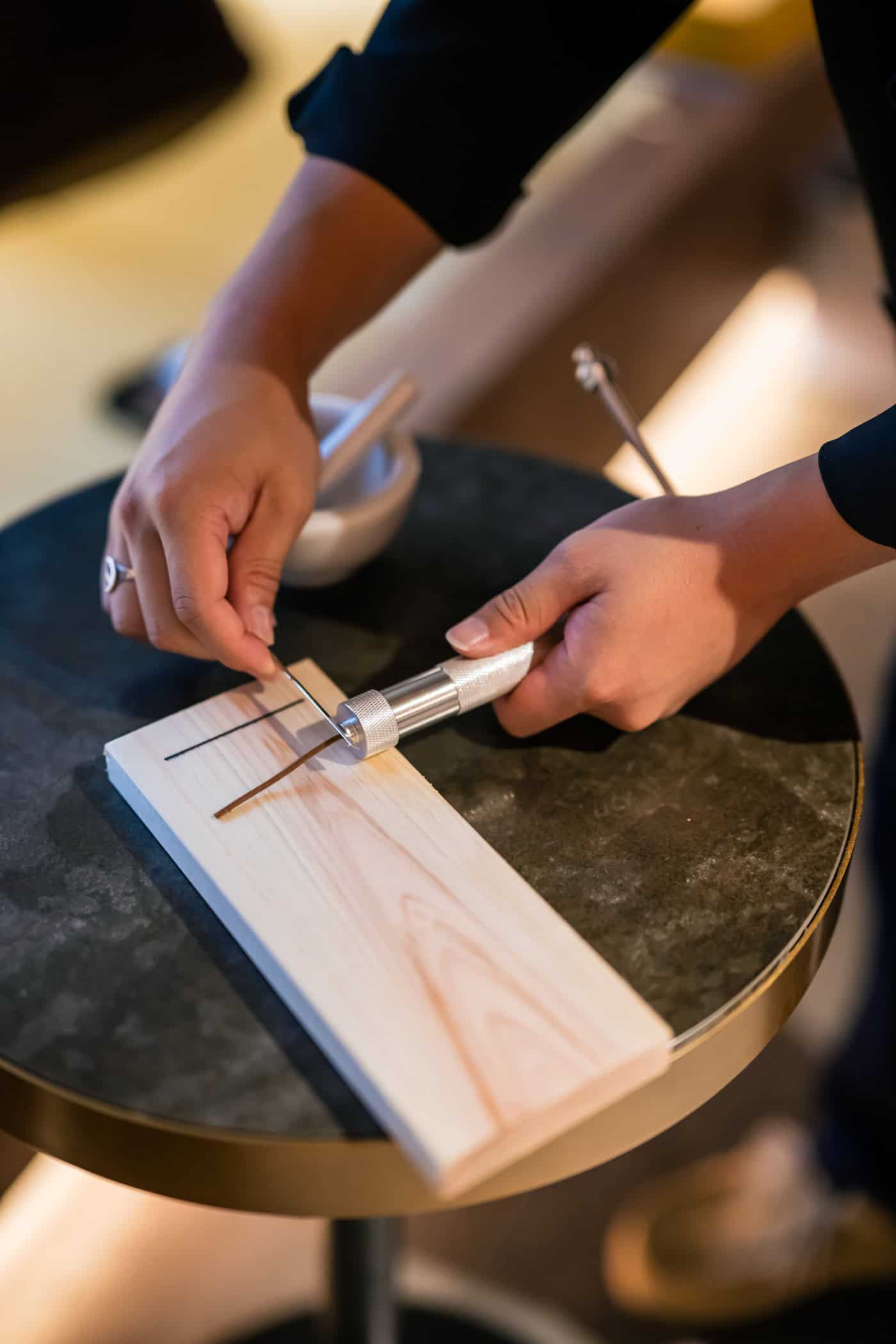 4種のアロマと白檀はじめ4種の椨粉を、数種類ずつ混ぜて調合し、好みの調香で