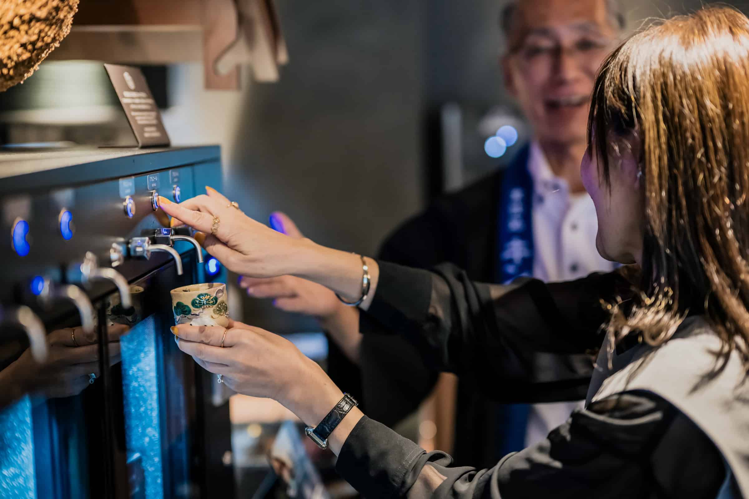 日本酒サーバーの一角は、酒蔵の風情をかもし出す趣き深い空間で、