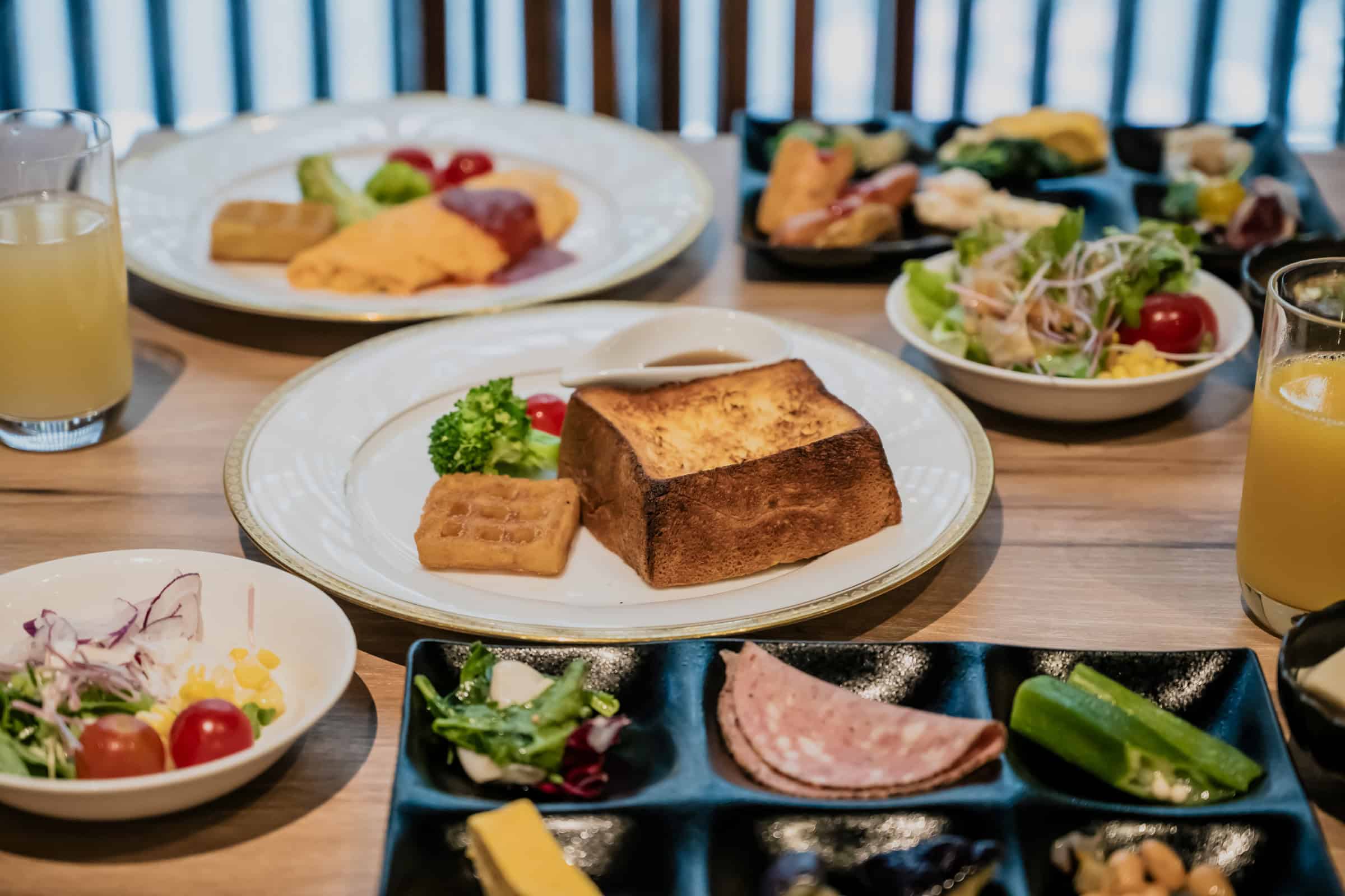 朝食は、別棟の食事処でフレンチトーストやオムレツなどメイン料理をオーダーした後は