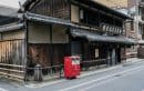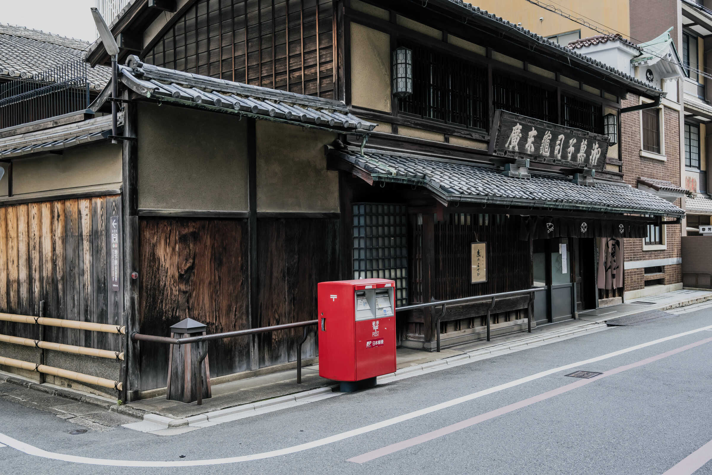 老舗和菓子店「亀末廣」。重厚な木造建てと赤いポストのコントラストが、印象的です。