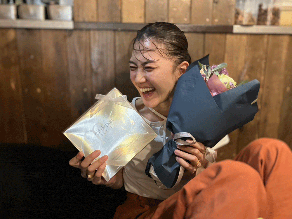 しかもサプライズで誕生日のお祝いもしてもらい、嬉しびっくり。綺麗なお花とクレドポーボーテのセットをいただきました。