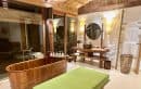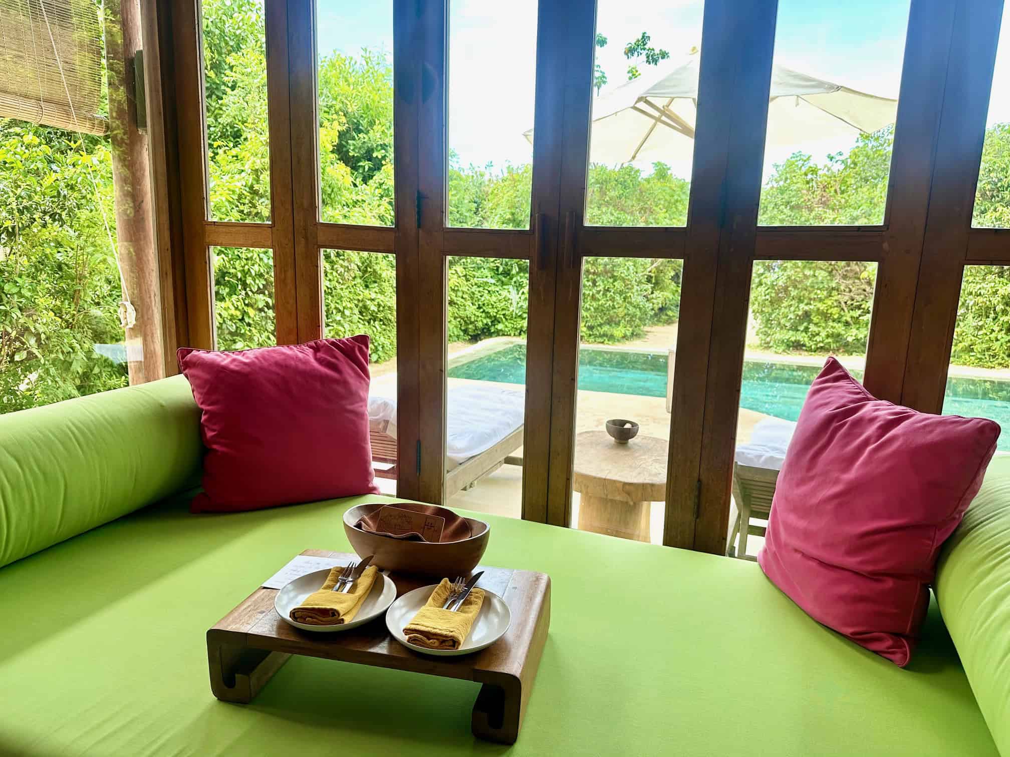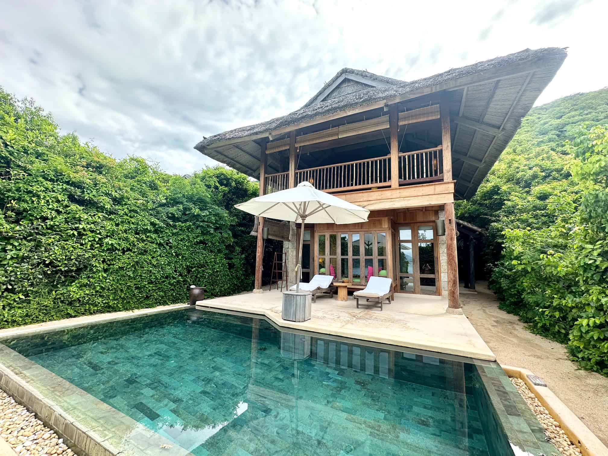 今回滞在したのはビーチフロントヴィラ。2階建ての室内の1階には寝室とバスルーム、窓や壁がない2階には開放感あふれるリビングとミニバーがある独創的なデザインの建物です。ヴィラの前には広々としたプライベートプールがあり、その先はプライベートビーチへと続きます。プールサイドのリクライニングチェアでくつろぎながら、ルームサービスで食事をしたり、読書や昼寝をしたり、気の向くままに優雅な時間を過ごせます。