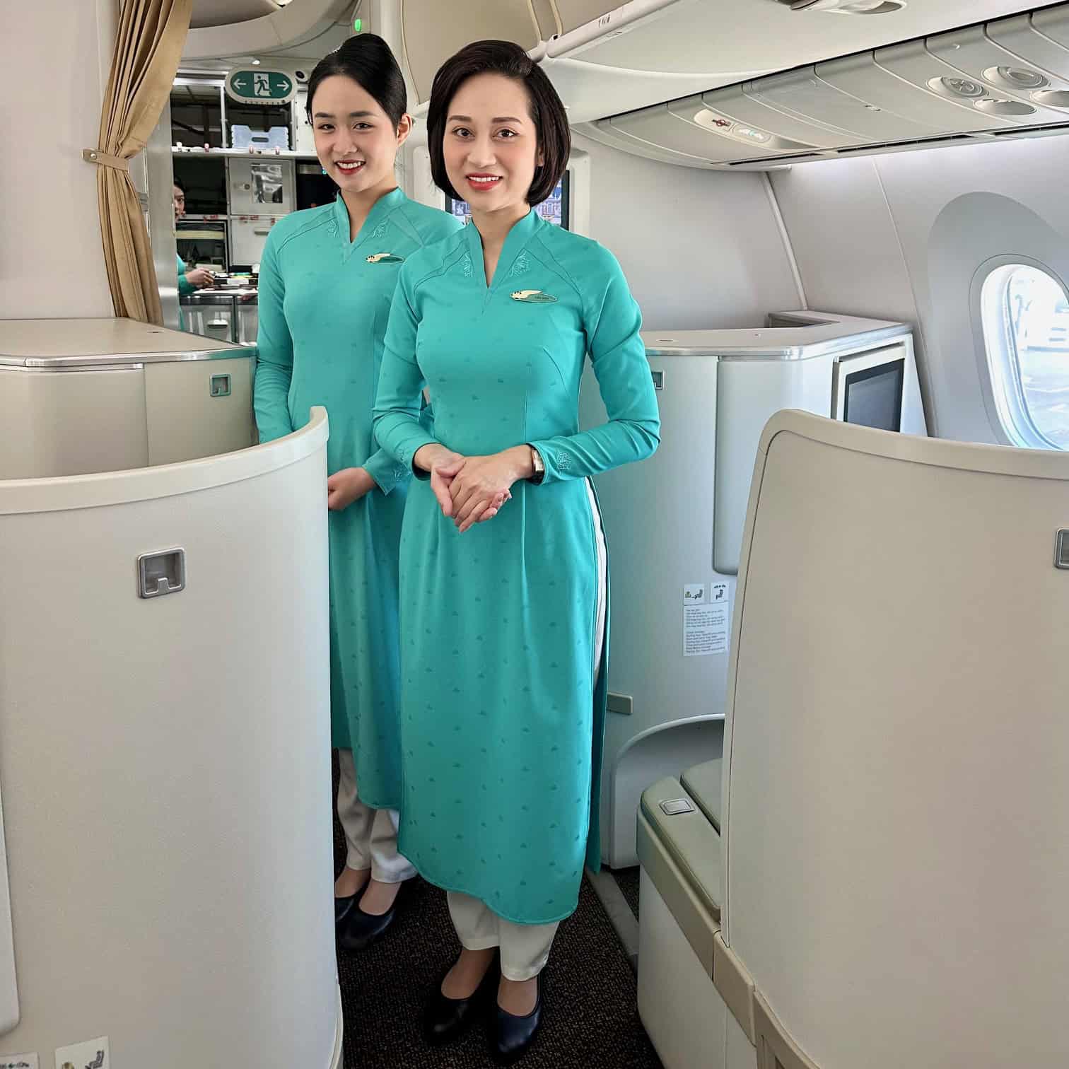 客室乗務員が民族衣装のアオザイを着て、お客様をやさしくお出迎え。