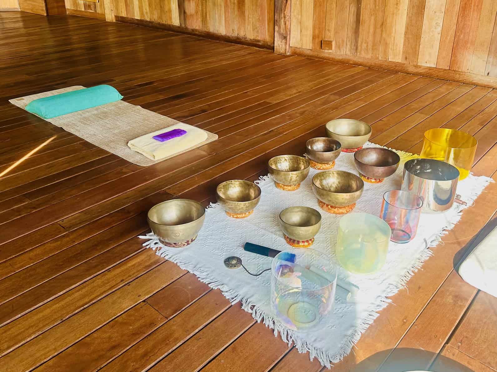チューニングフォーク、シンギングボウル、バイノーラルビートなど多様な道具を使ったサウンドバス(様々な楽器が生み出す響きに身をゆだねる)の体験