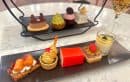 また、セイボリーは、パテ・ド・カンパーニュに細かく刻んだピスタチオを盛ってラズベリーを添えたカナッペや、カリフラワーのフランとコンソメジュレを層にしてキャビアを添えたグラスデザート風、スモークサーモンとトリュフクリームが好相性な一品など、華やかな食材を使ったラインナップです。