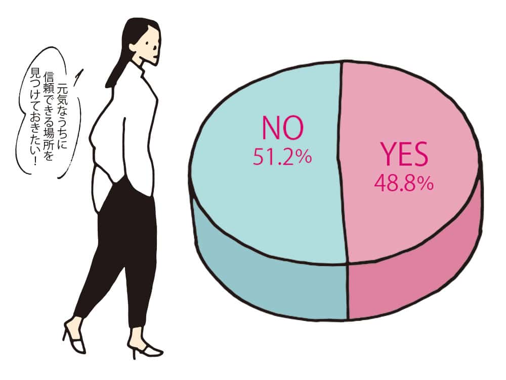 かかりつけの婦人科がある人とない人が半々という結果ですが、40代になったら更年期に備えて、かかりつけ医を持つことが重要。「急に更年期の相談に来てもらっても、普段の様子が分からないと診断が難しい」という婦人科医の声も。