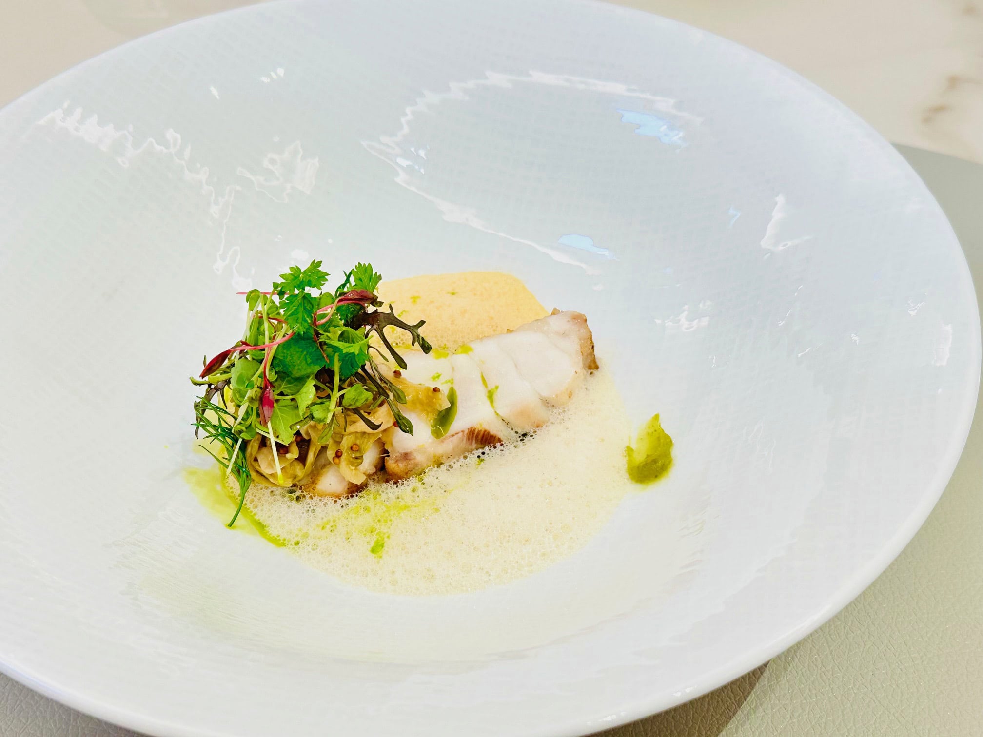 デザインホテルとして知られる「ホテル イル・パラッツォ」に併設されていたチャペルをリノベーションしたため、天井高6mを超える開放的な空間も素敵。内装の設えは、料理が最も美しく輝くために白一色で統一されており、一歩足を踏み入れた瞬間その世界観に引き込まれます。