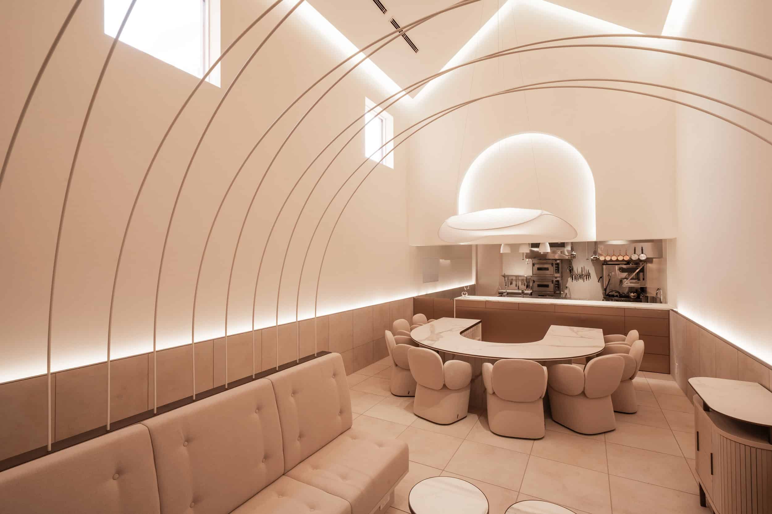 柔らかな白のグラデーションに光が生む陰影で建築のフォルムを際立たせているのも見事。テーブル上にある照明は花、ウェイティングスペースは庭をイメージしており、庭で憩いながら花の下で食事を楽しむ雰囲気を醸しています。