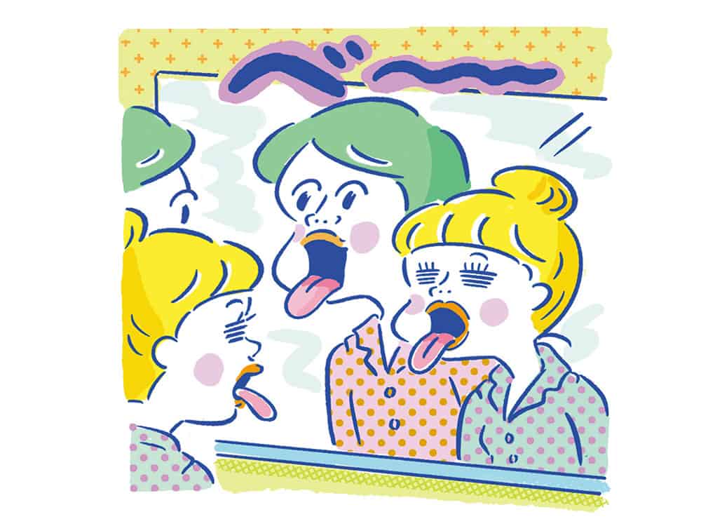 舌をあごにつける気持ちで下に「ベー」と出す。舌の落ち込みを防ぐことでいびきを改善。