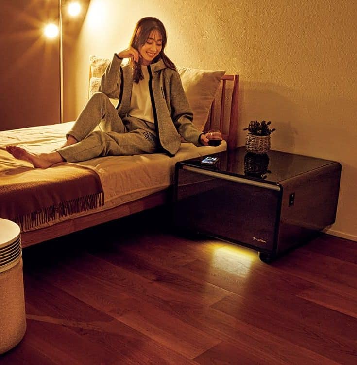 逆に寝室の家電は目立ちにくいものに。グレーのカーテンの前には同色の空気清浄機を。