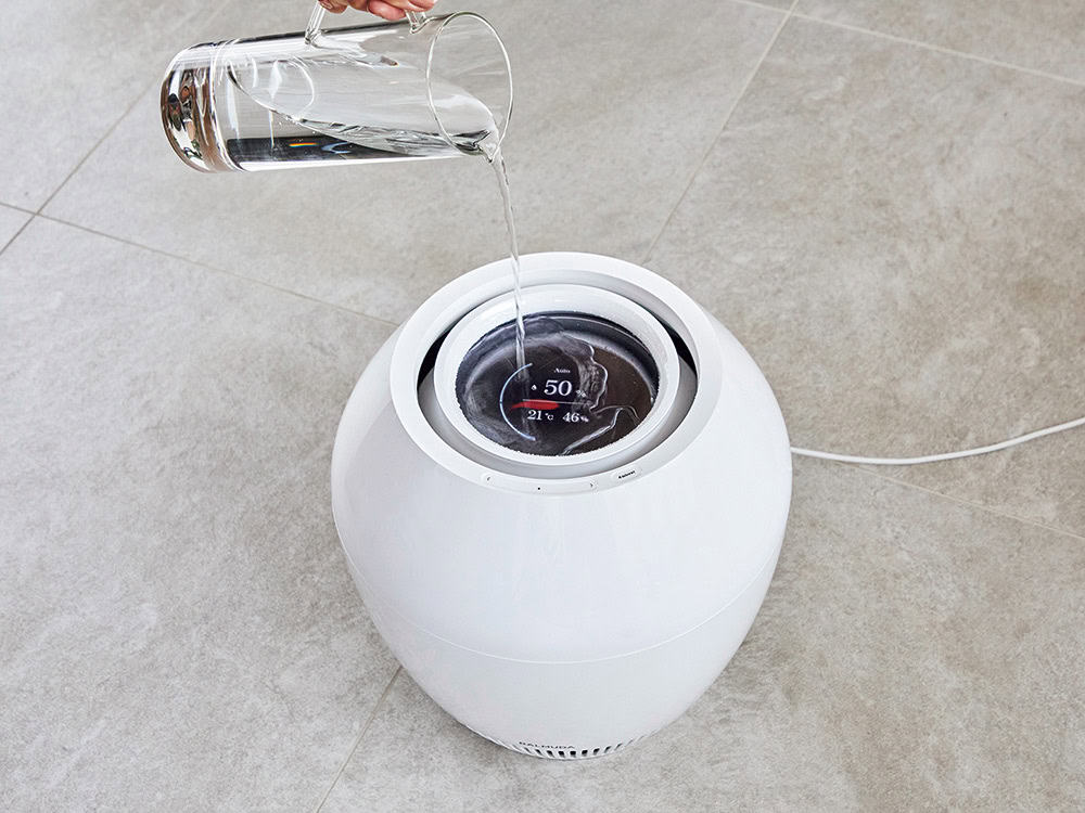オブジェのようなフォルム。水を注ぐ姿もたおやかな〝映え〟しかない加湿器。タンクレス構造で、給水は上から注ぐだけ。刷新されたディスプレイと光が、日々の給水や操作に応じて、心地よく変化する。