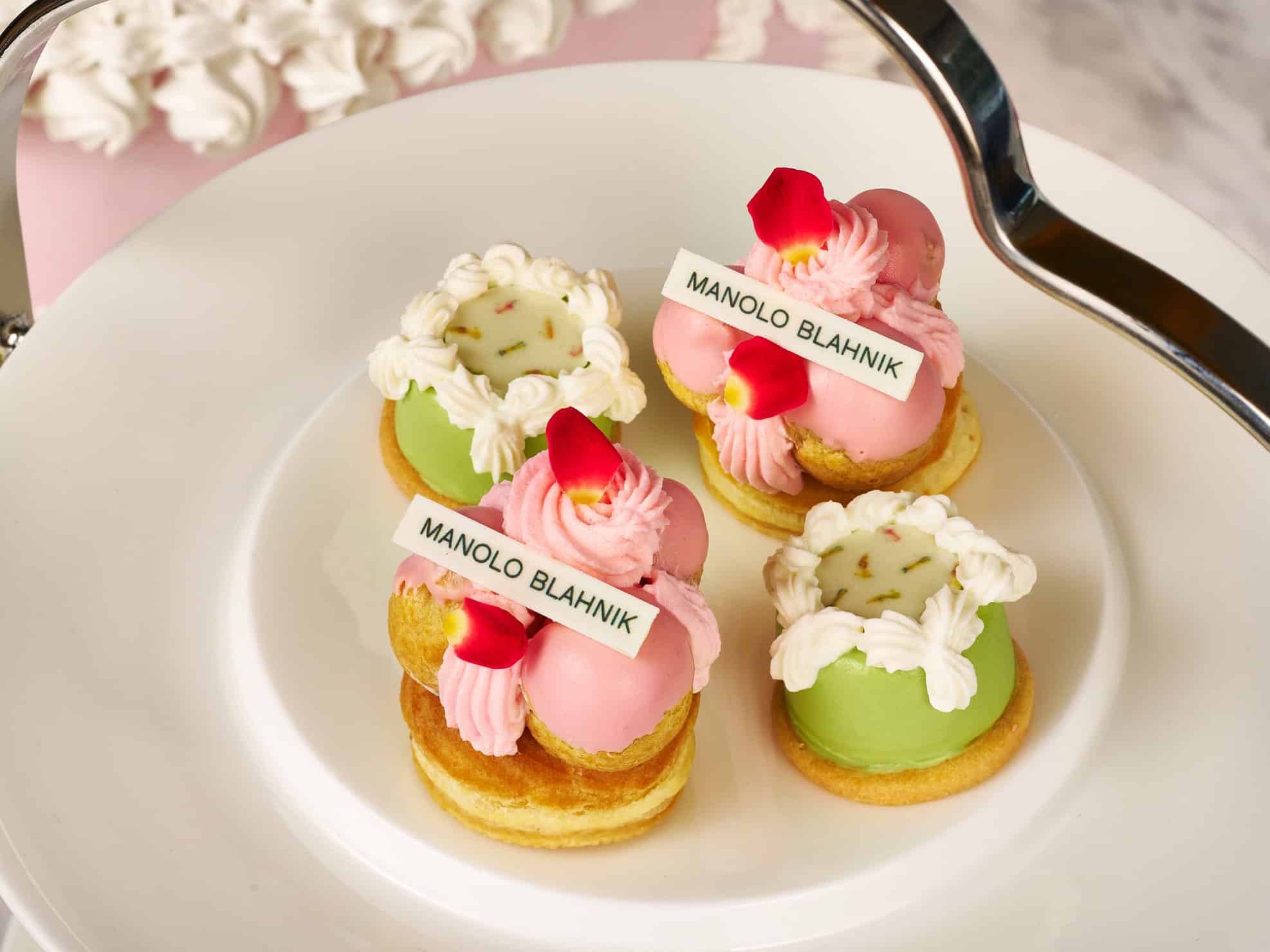 マノロ ブラニクの柔らかな色彩感覚と、マリー・アントワネットに息づく優雅な美意識を、セントレジスのペストリーシェフが繊細な感性で表現した見目麗しいアフタヌーンティーが登場。可憐な彩りと庭園を思わせる軽やかな香り、口の中でほどける繊細な甘さが、テーブルを華やかに彩ります。
