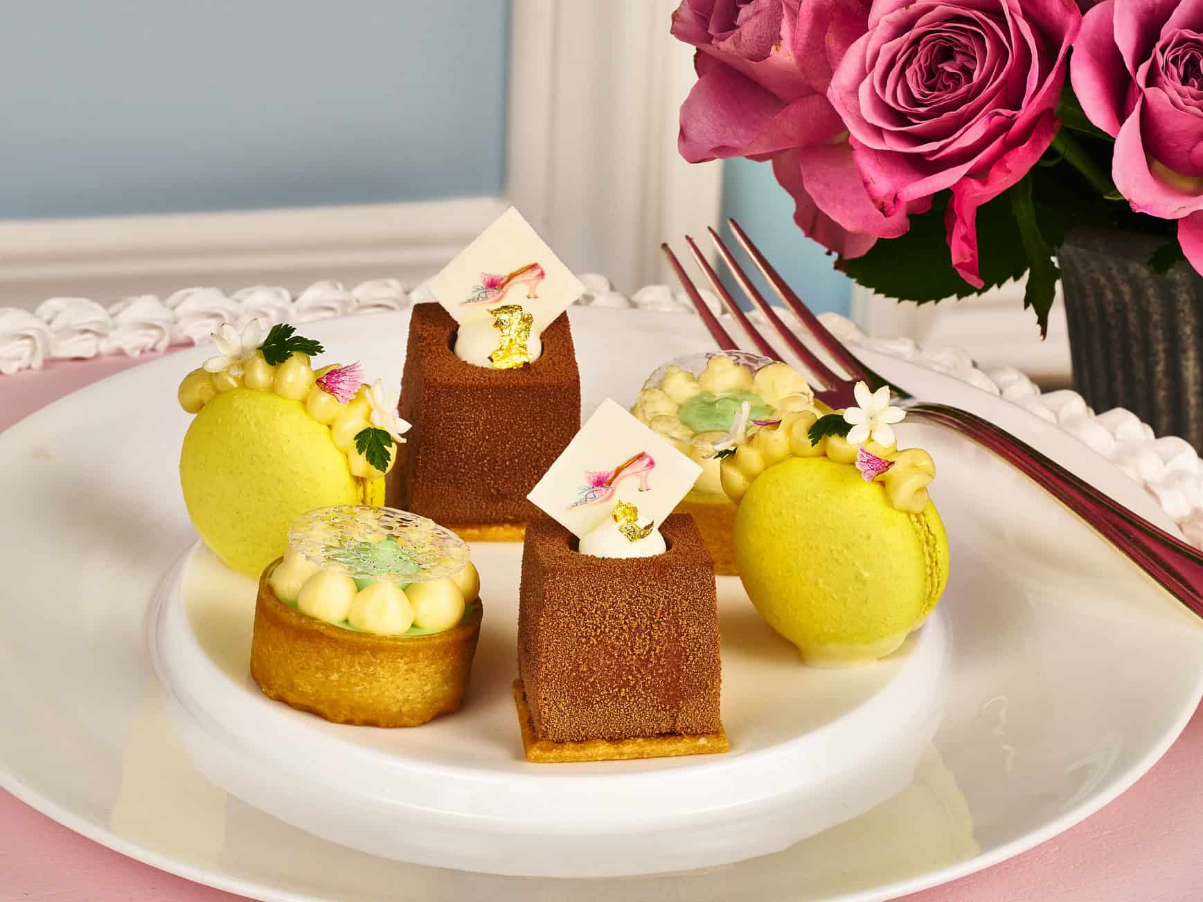 キャラメルを含ませたデニッシュにバニラムースをなめらかに重ね、ふくよかな甘みと淡い香りが寄り添う、どこか懐かしく落ち着いた味わいの「パンプディングとバニラのムース」、華やかに飾られたマカロン、シューズが描かれたプレートを添えたチョコレートムースなど、柔らかな光に包まれた宮廷の午後を思わせる美しいスイーツが並びます。甘さと香りが静かに重なり合い、心をやさしく満たす至福の時間です。