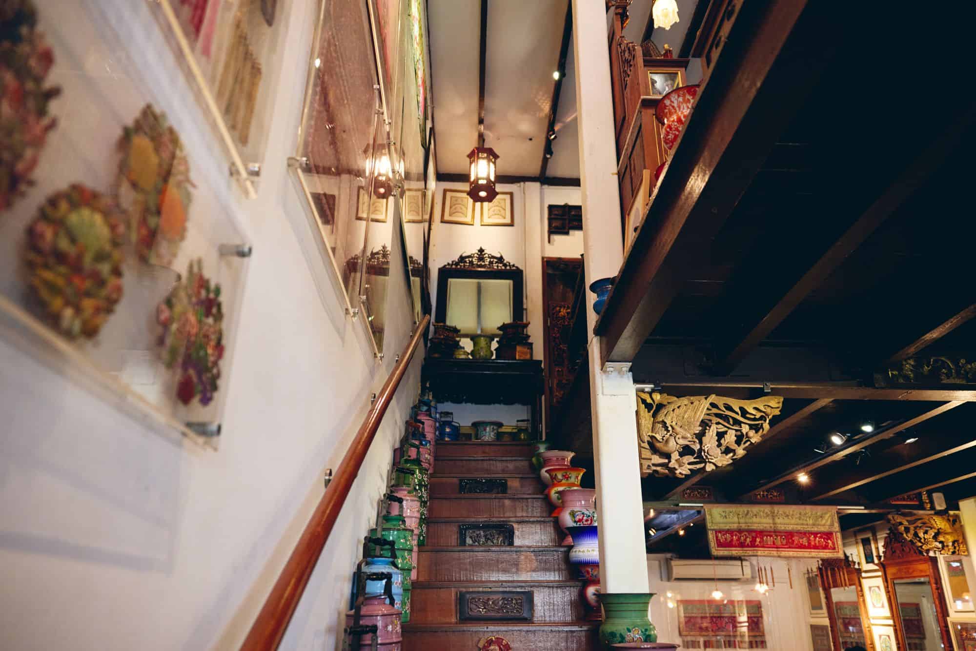 シンガポールの歴史、文化を知る上で欠かせない観光地のひとつ、ジョー・チャイアット/カトン地区にあるプライベート博物館「The Intan(ザ・インタン)」へ。オーナーのアルビンさんが長年かけて集めたプラナカン文化にまつわる骨董品や工芸品を一般公開しています。ビーズ刺繍のスリッパや、カラフルなツボ、家具などを丁寧に説明してもらえるのが嬉しいポイントです。プラナカンタイルに色を塗るワークショップや、民族衣装を試着させてもらう体験もあり、ただ見るだけでなく体験する博物館としての魅力もありました。