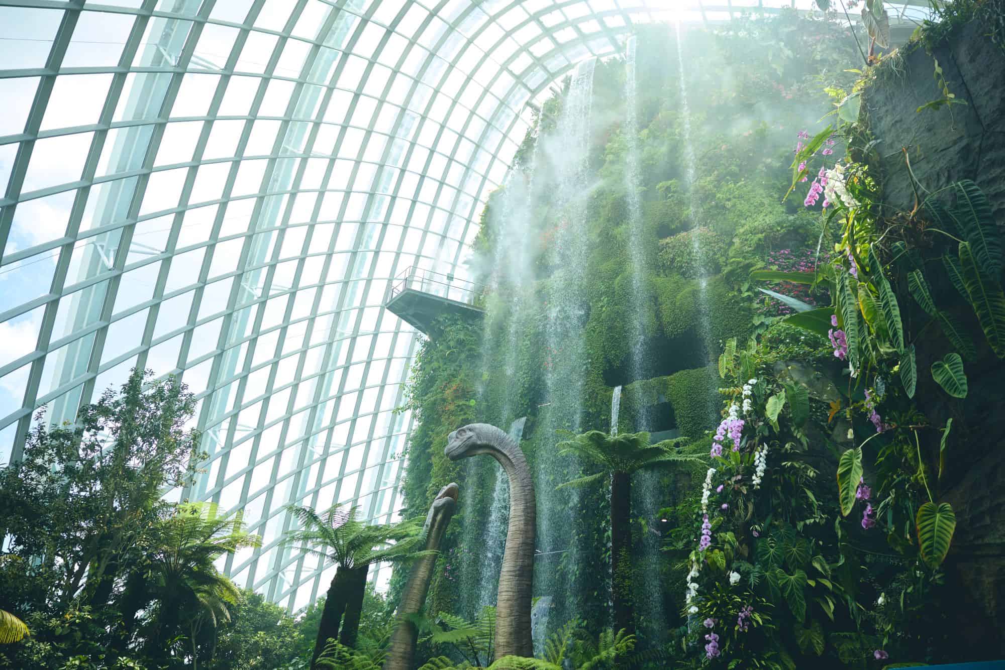 また、世界最大のガラス温室フラワー・ドームでは、熱帯から温帯まで、多様な植物を見ることができました。温室内は空調がしっかり効いていて、シンガポールの暑さを忘れるほど心地よい空間です。滝が流れ落ち、山のような植生が広がるクラウド フォレストでは、映画『ジュラシック・ワールド』とのコラボレーションが行われており、館内のあちこちに恐竜たちの姿が。迫力があり、大人はもちろん、お子さんと一緒に訪れても楽しめるスポットでした。