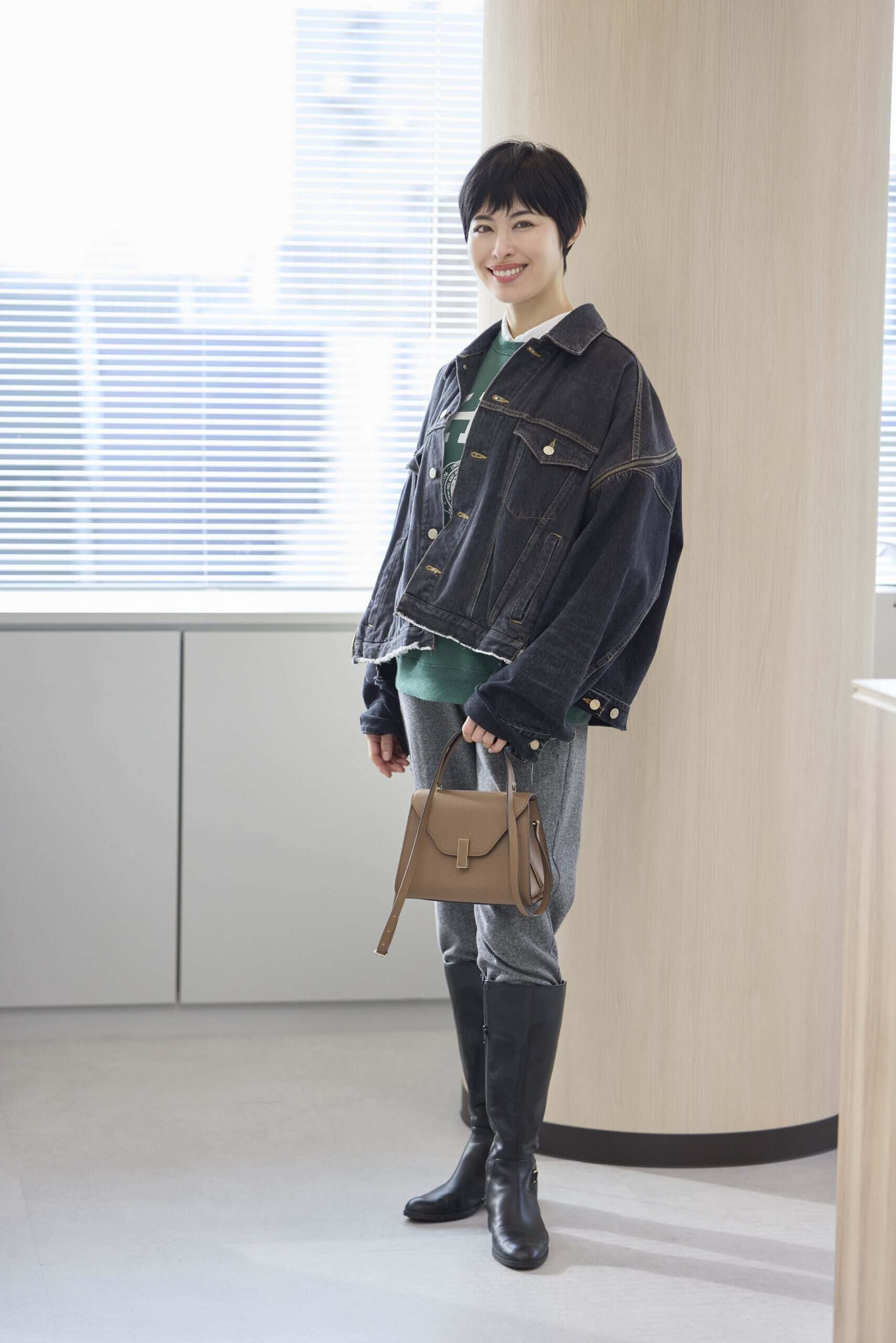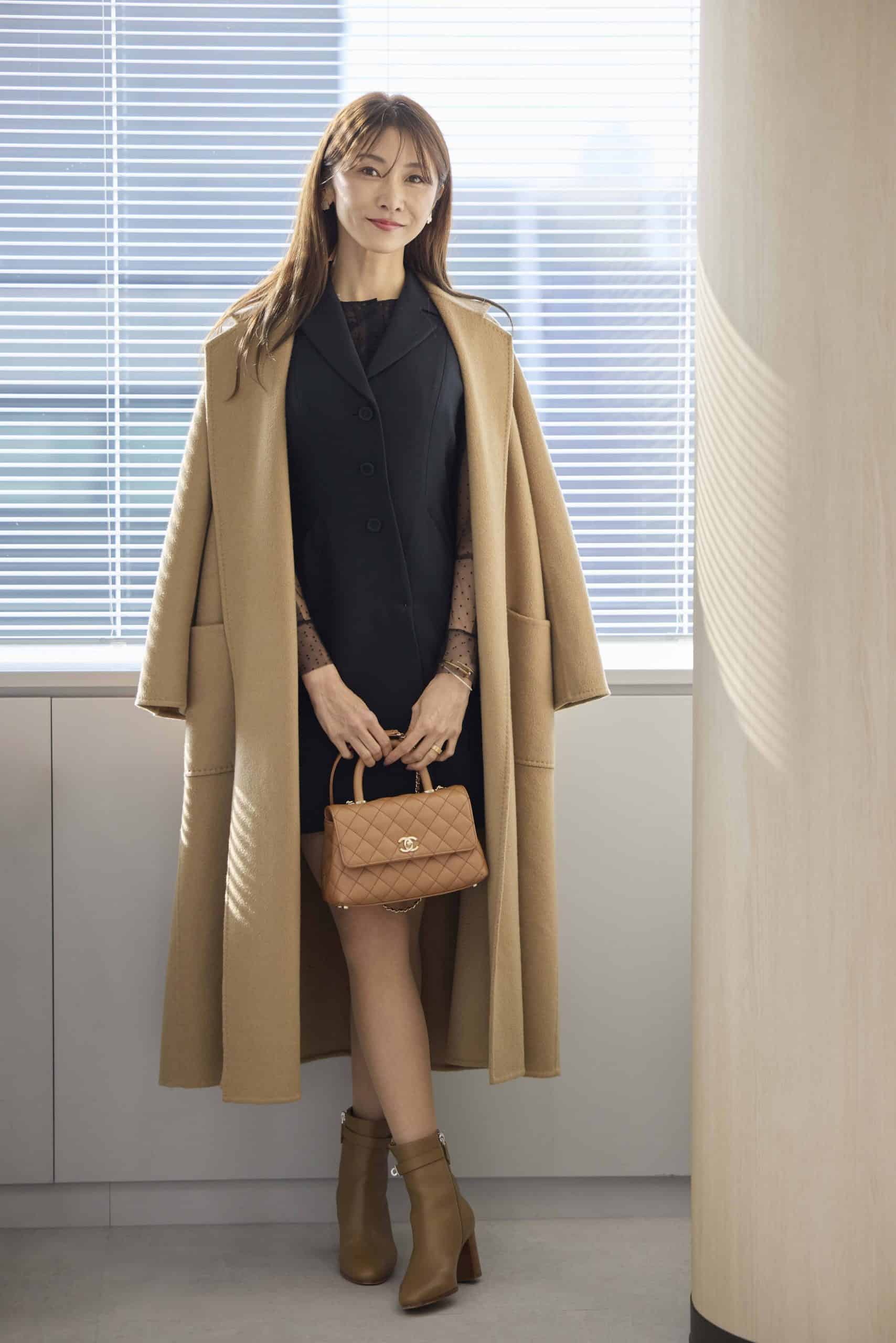 梅田育恵さん ほぼ黒コーデをベースに、ブーツ・コート・バッグをベージュで統一。イベント参加ということでミニ丈を選びつつ、ロングコートを合わせて大人っぽさも意識したスタイリングで参加してくれた梅田さん。