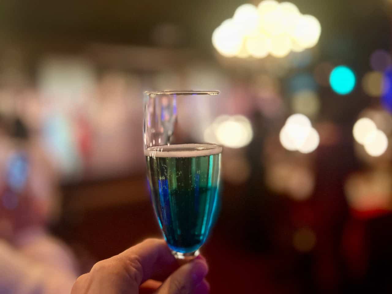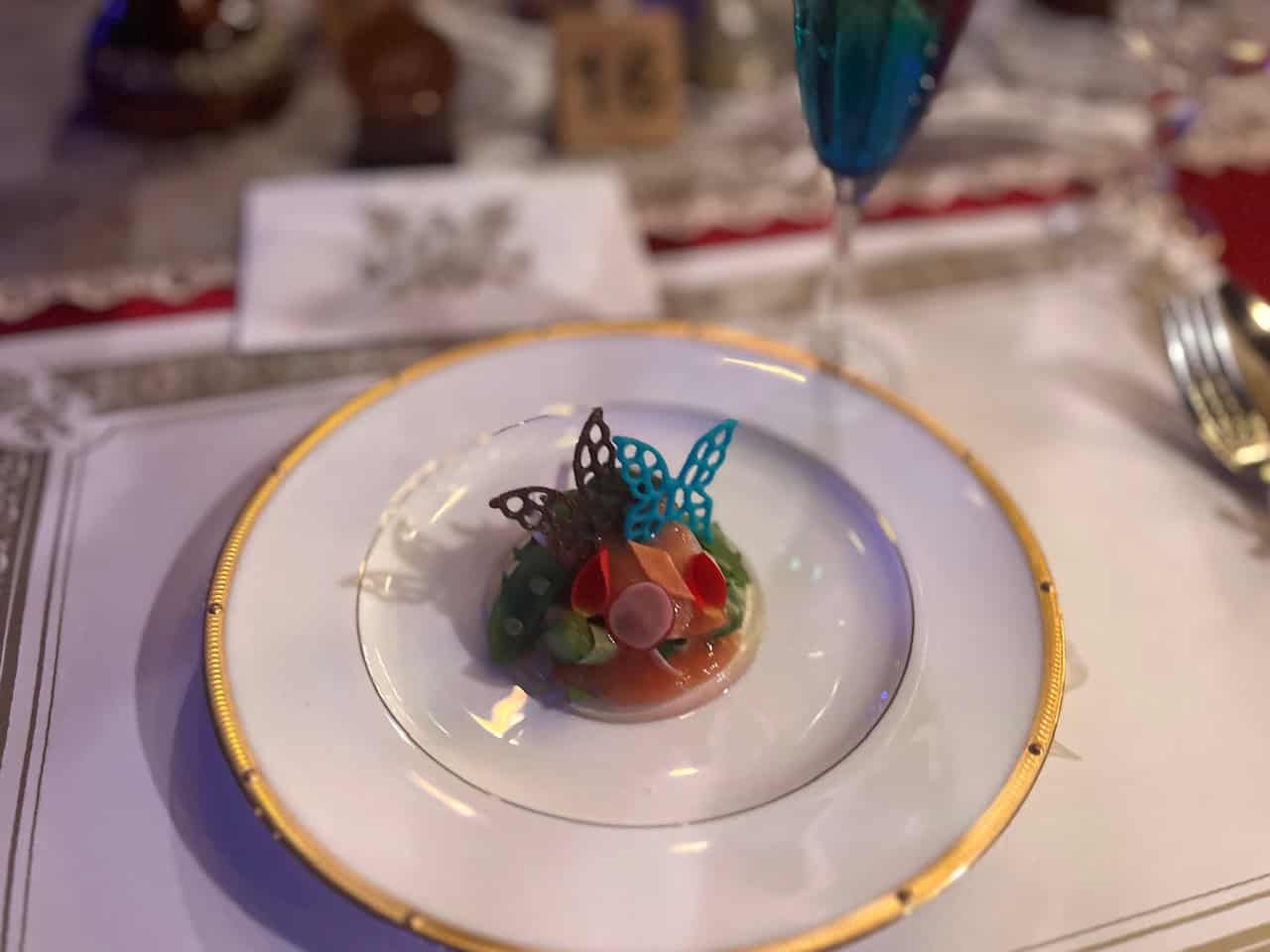 前菜の前にシャンパンで乾杯をします。(ノン・アルコールも選ぶことができます。)その時にテーブルに置かれたシロップを入れるのですが、私のものは美しいブルーでした。赤色の方もいるようで、こちらもストーリーと関係があるのか気になるところです。