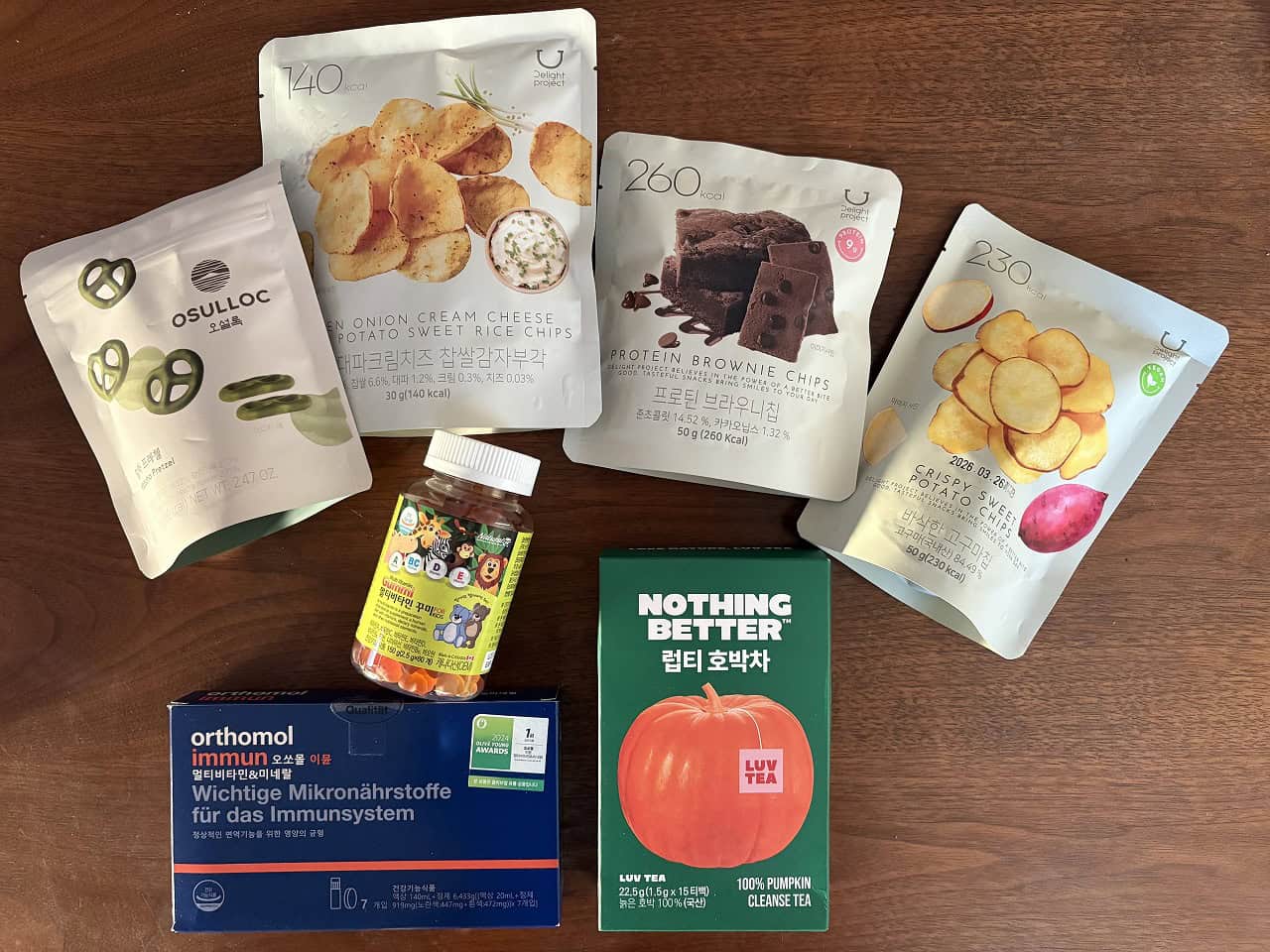 まずは定番・オリヤン(OLIVE YOUNG)でお買い物。低カロリーおやつ「Delight project」シリーズや、グミ、むくみ対策のお茶「NOTHING BETTER」など、話題の美容フードを中心に購入。