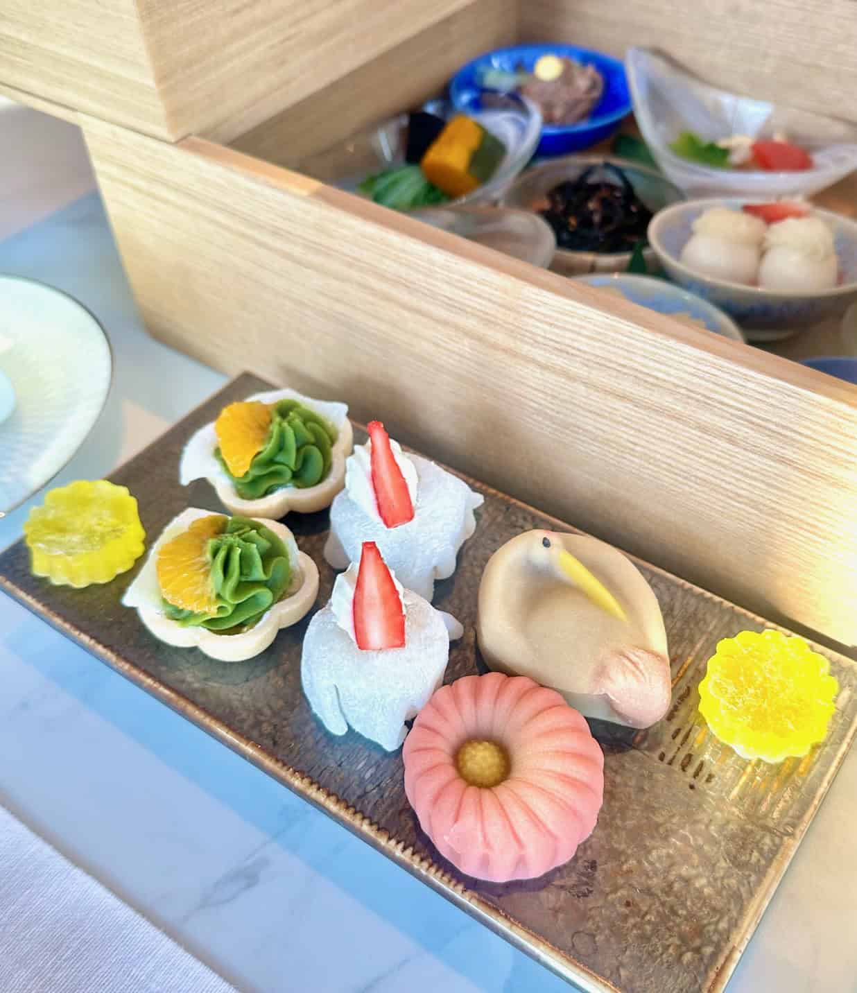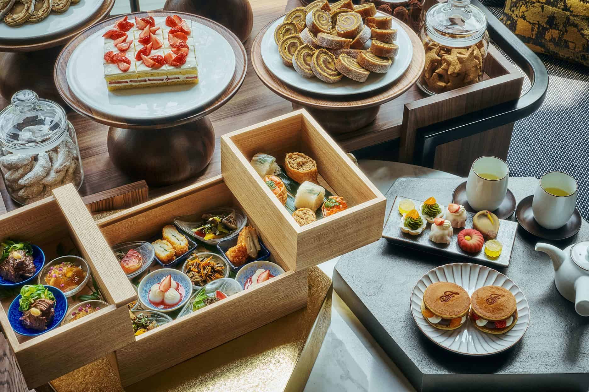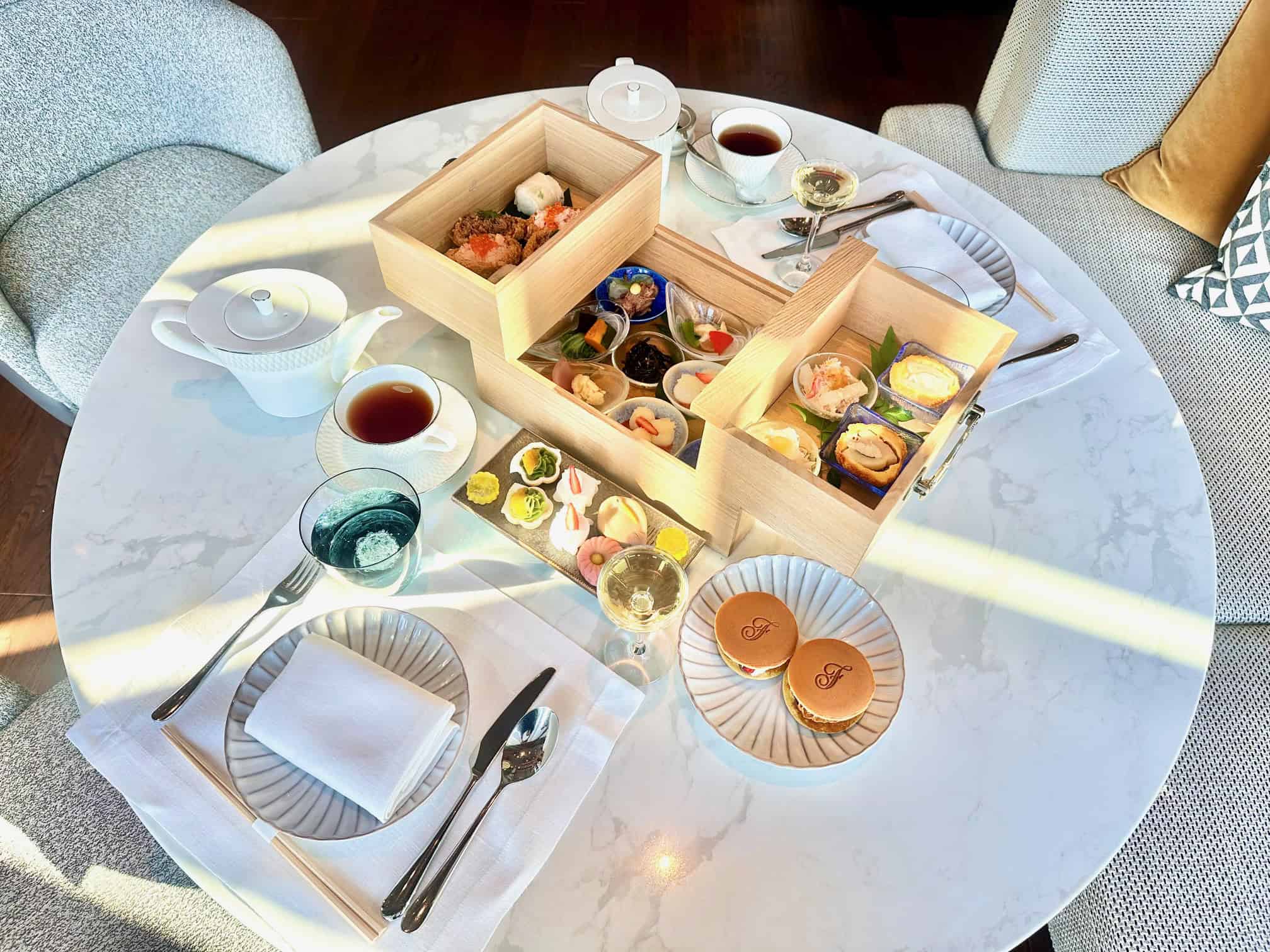 東に東京湾、西に東京タワーや都心の風景を一望する絶好のロケーションに位置するラグジュアリーホテル「フェアモント東京」の35階ロビーラウンジ「Vue Mer(ビュメール)」にて、オリジナルの美しい木箱に丁寧に収められた「和アフタヌーンティー」が2月28日(土)まで期間限定で開催中です。