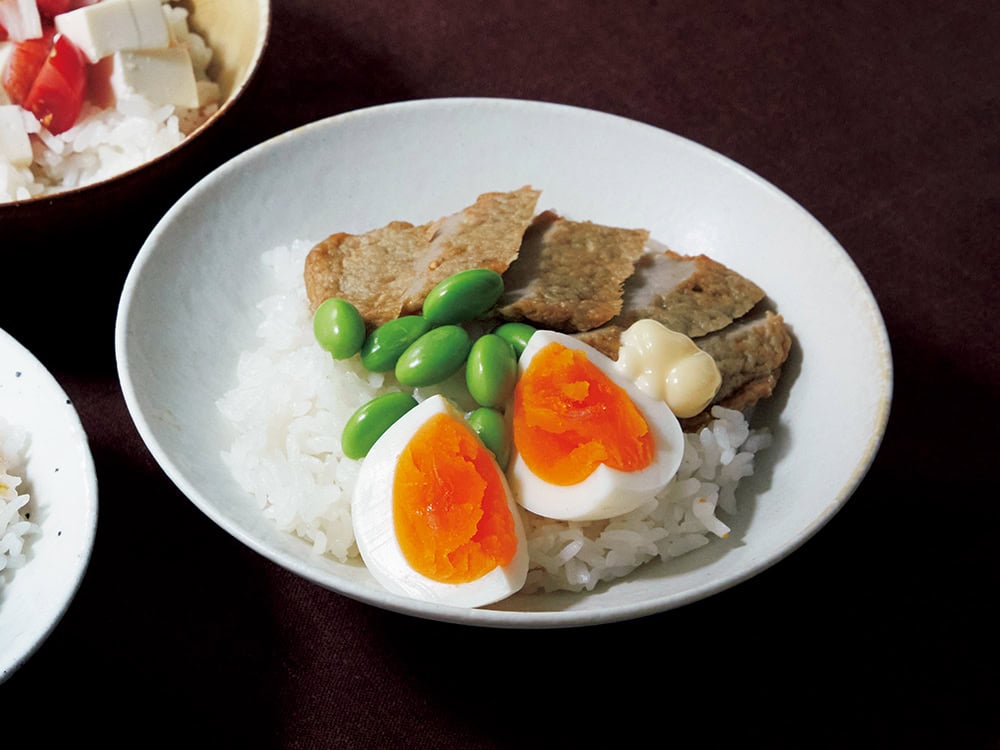 ❸ 温泉卵をのせ、蒲焼のタレをかけて完成。