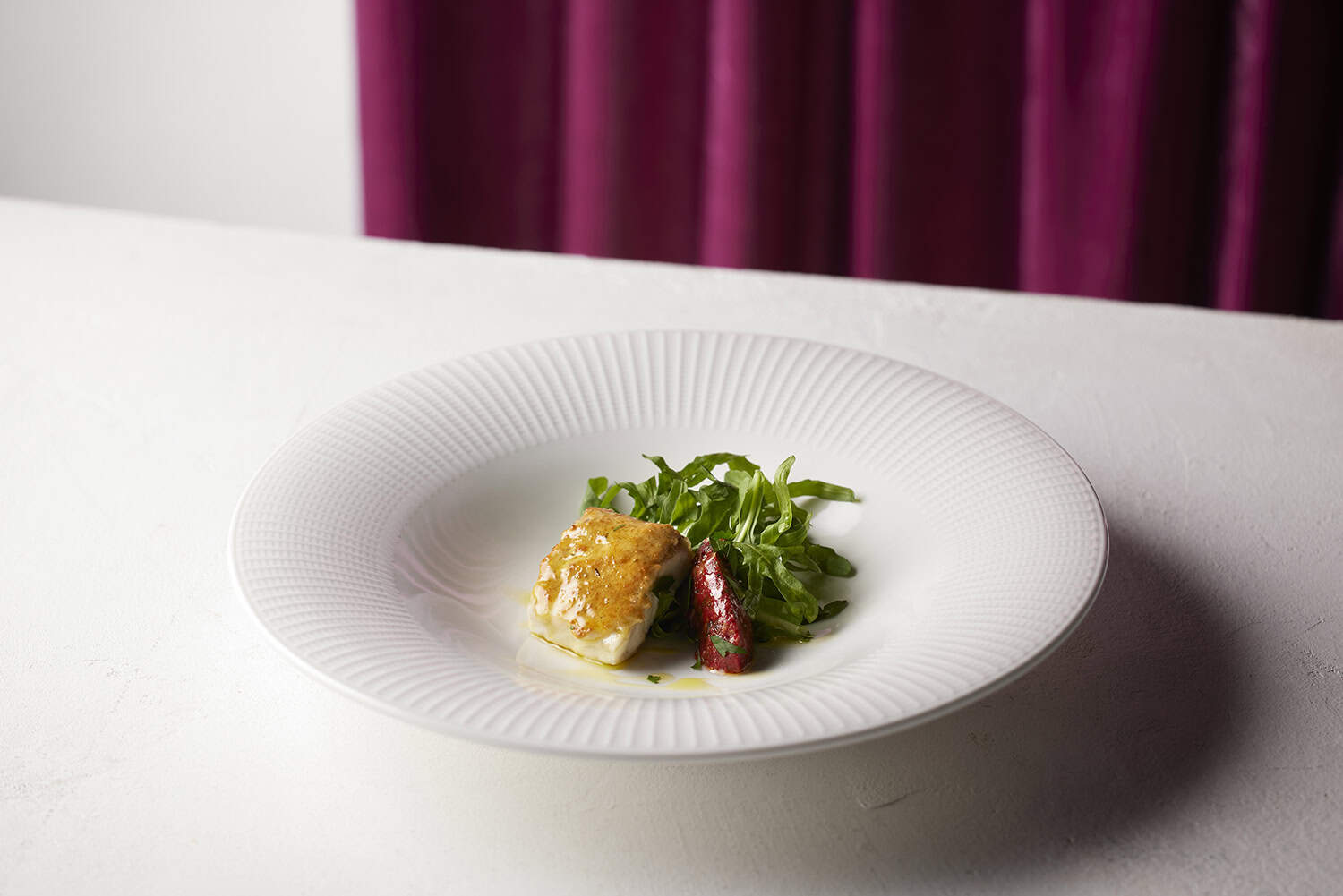 400℃のやさしい強火で焼き上げた真鯛に、イタリアシチリア島発祥の爽やかなサルサを添えてサーブ。ニンニクとハーブ、レモンの香りが広がる一皿です。