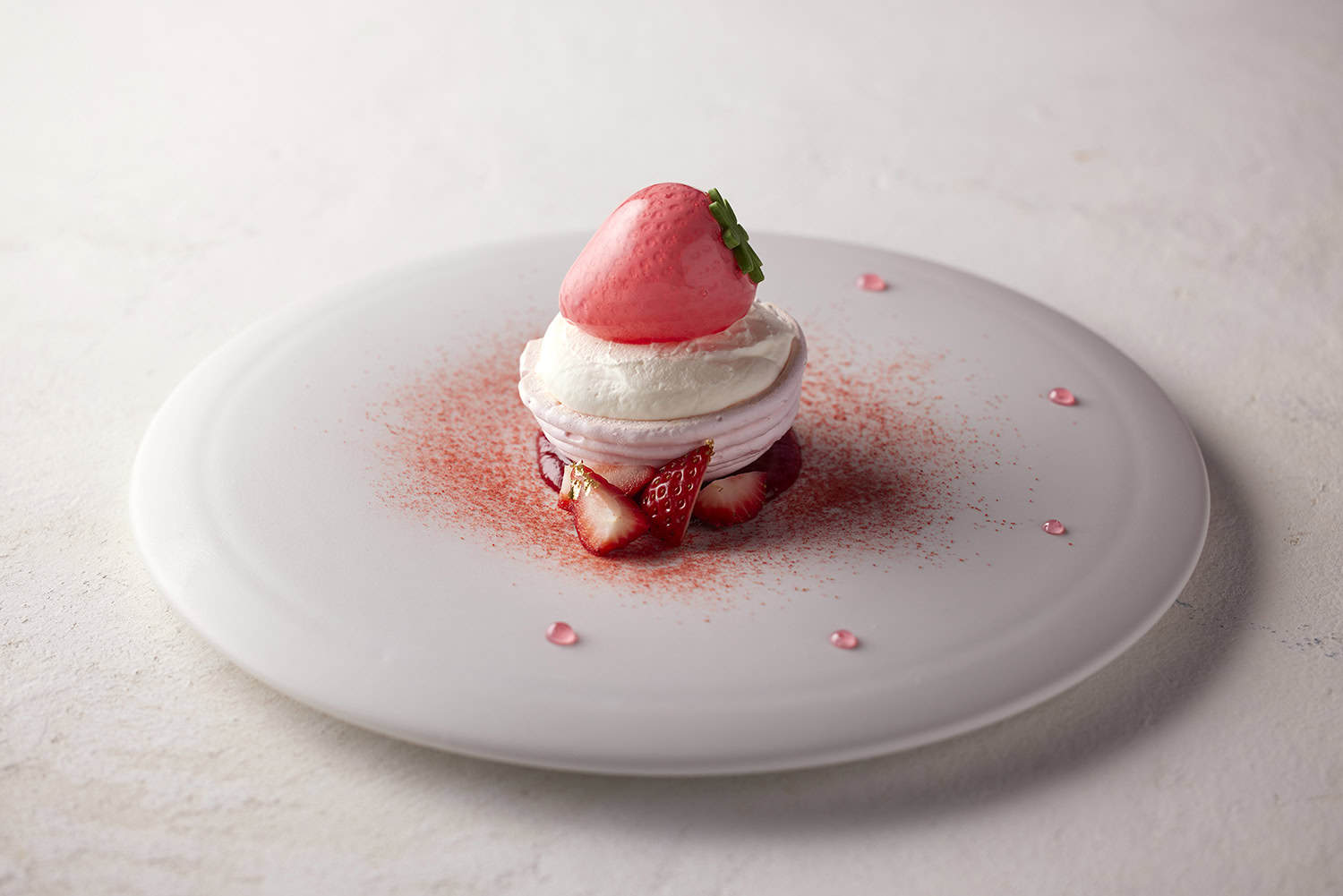 サクサクに焼き上げたメレンゲにいちごソルベ、チーズムース、いちごのコンフィ、いちごソースなどを重ね、サイドには国産いちごをトッピング。サクサクのメレンゲ、ふわふわのクリーム、冷たいソルベが織りなす異なる食感と、いちごの甘酸っぱさがとろけ合う、いちごの魅力を満喫できるデザートです。いちごを模したソルベも可愛い♡