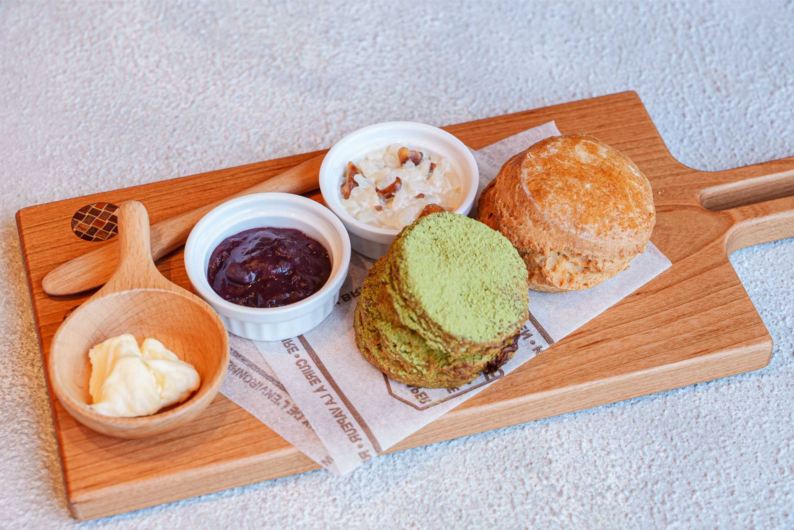 定番人気の「全粒粉スコーン」と、シーズン限定の「抹茶のスコーン」。中には豊かと繁栄として幸せを呼び込むと言わせる開運フード“イチジク”が忍ばせてあります。オリジナルの2種のコンフィチュールも絶品。