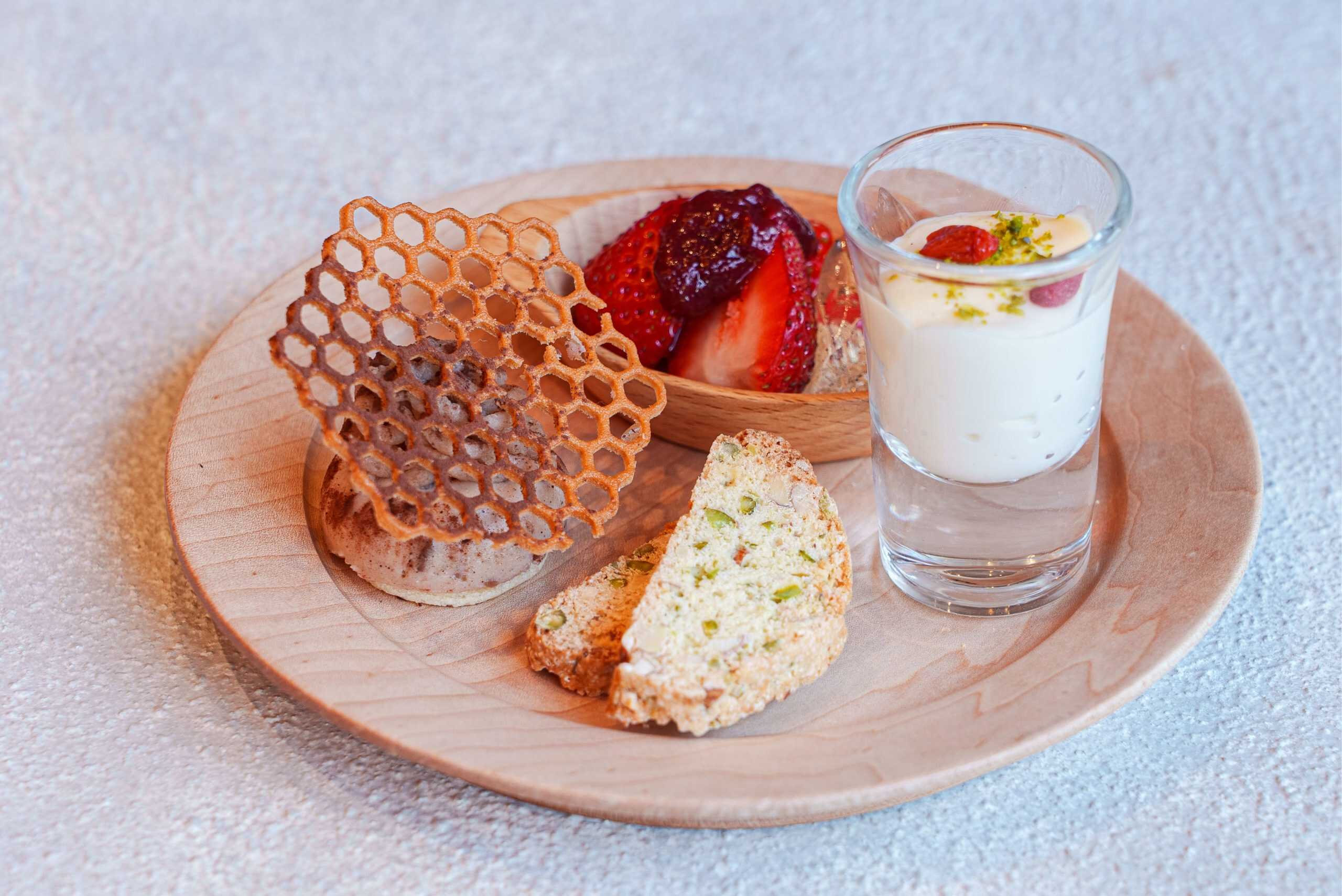 2段目は、「苺と昆布のゼリー」のほかに、不老長寿の実と言われるクコの実がトッピングされた「ブランマンジェ」、甘さ控えめでナッツの風味が豊かな「ビスコッティ」、健康の象徴とも言われる栗を使用した優しい甘さの「栗のムース」がラインナップ。