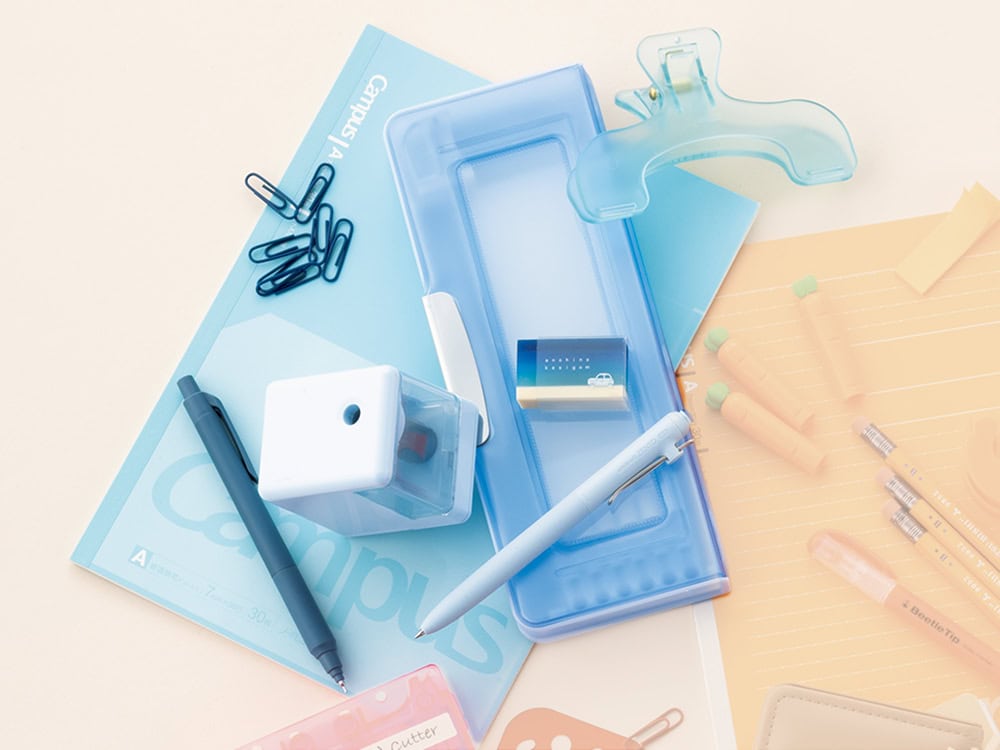 頁を開いて留められるクリップ¥660(ウカンムリクリップ・モーニングソーダ/サンスター文具)クリア筆箱¥2,200(ヨコピタミテ クリアブルー/サンスター文具)ノート¥242(キャンパスフラットが気持ちいいノート〈ドット入り罫線〉/コクヨ)消しゴム¥330(あの日の消しゴム・真夏のビーチ/サンスター文具)ボールペン¥275(ユニボール ゼント ベーシックモデル 0.5㎜青/三菱鉛筆)電池式鉛筆削り器¥2,200(ノマモ・ブルー/サンスター文具)シャープペンシルペン¥605(クルトガ KSモデル 0.5㎜ アイアンブルー/三菱鉛筆)