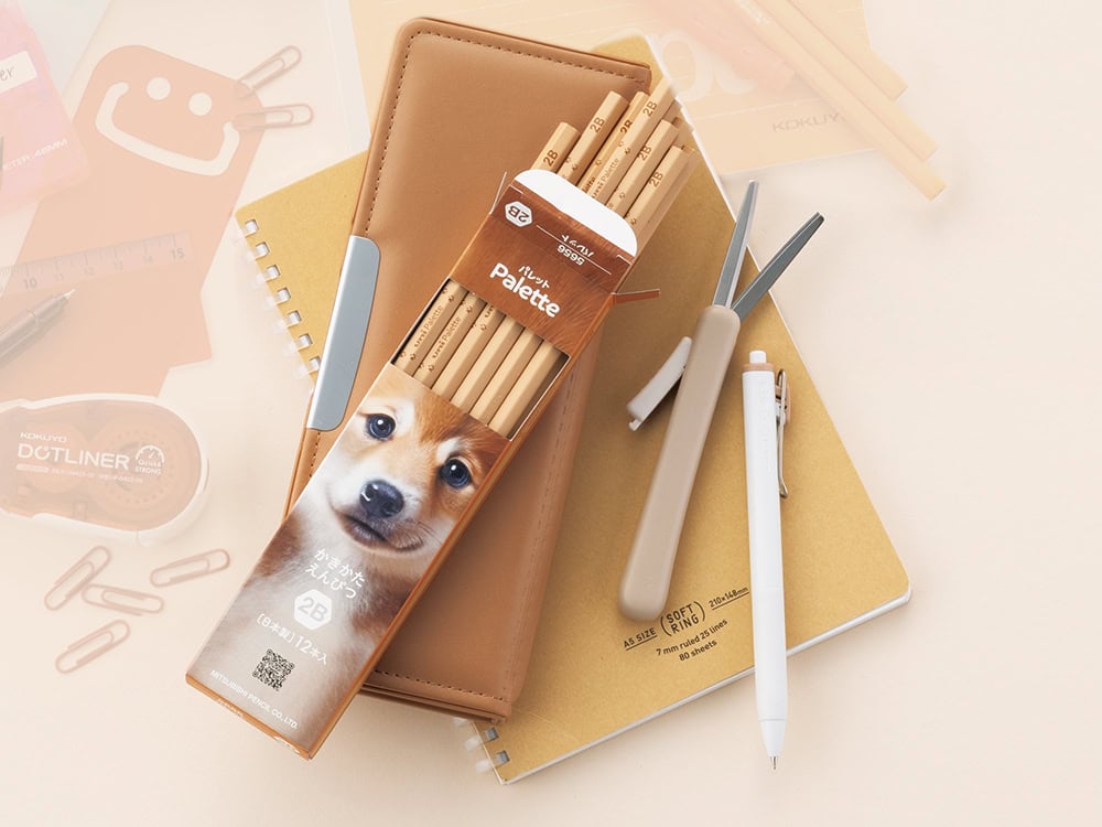 キャップがないスライド式の携帯ハサミ¥1,001(サクサポシェ/コクヨ)ボールペン¥132(ユニボール ワン 0.5㎜カプチーノブラウン/三菱鉛筆)ノート¥671(ソフトリングノート〈クラフト表紙〉/コクヨ)筆箱¥1,870(ヨコピタ・モカ/サンスター文具)鉛筆¥792(ユニ パレット ダース箱鉛筆 6角 アイボリー 2B/シバイヌ/三菱鉛筆)
