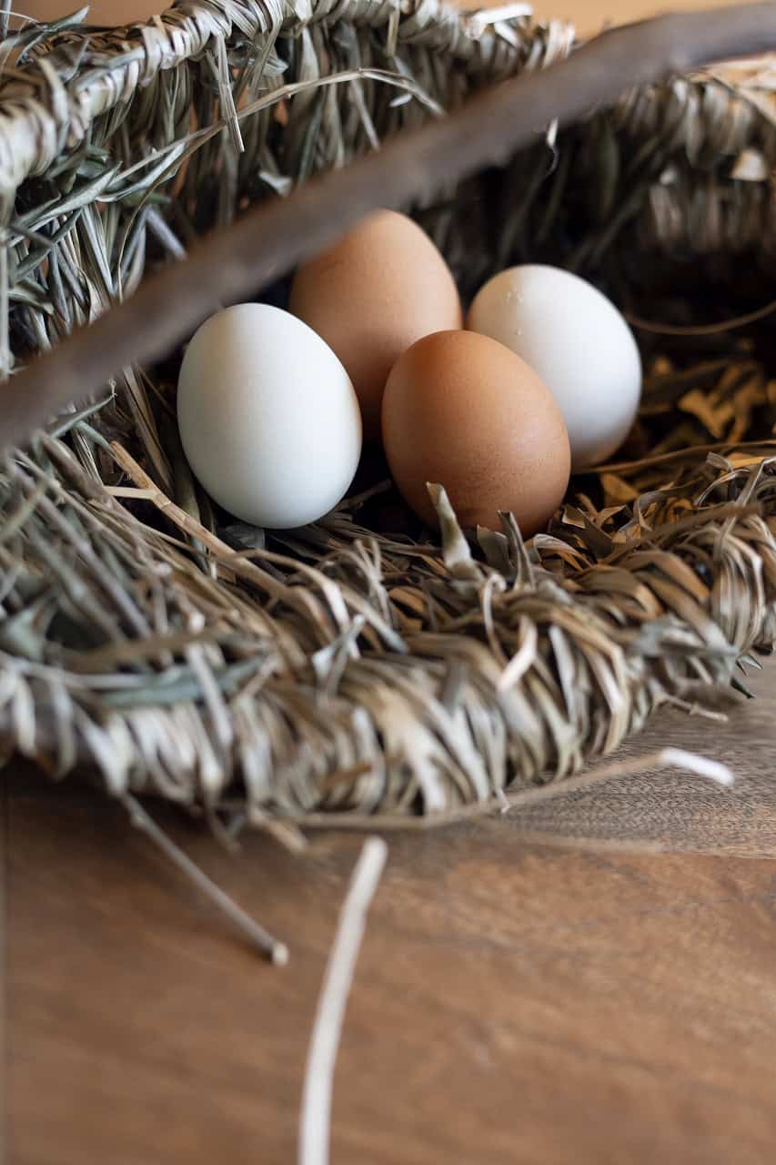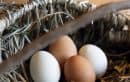 産まれたての卵、白の殻にほんのり青みを帯びた「アローカナ」と、深みのある赤い卵の「紅葉」