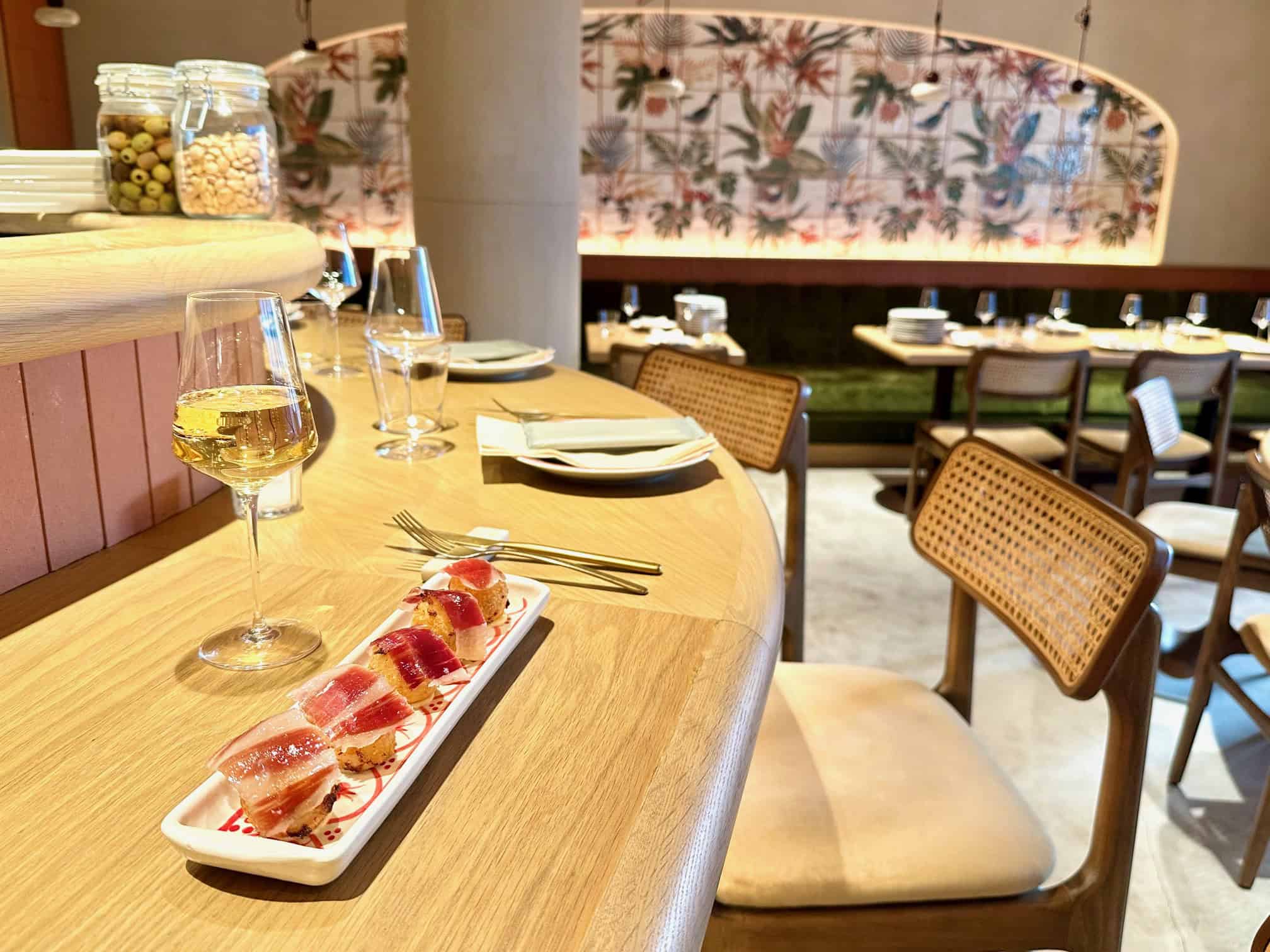 スペインの街角のような空間で切り立てハモンを味わえる!