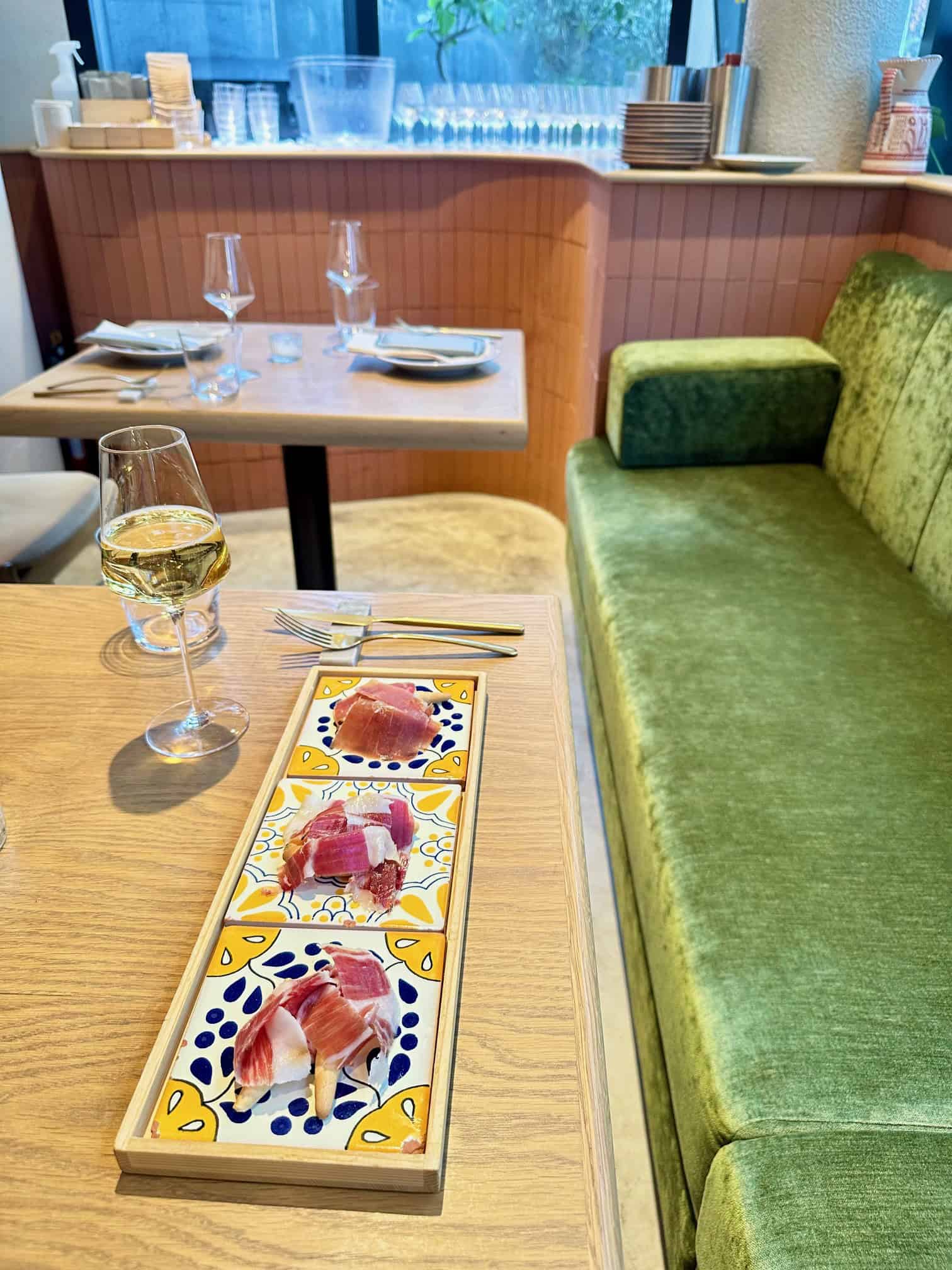 ランチは、香ばしく焼き上げたバケットに、ジューシーなビーフステーキと芳醇なハモン・イベリコをサンドした「Pepito(ペピート)」や、ハモンセラーノ&トリュフクリームのホットサンド「Bekini(ビキニ)」が人気のメニュー。ディナーは、ハモンとワインをゆったりと味わうアラカルトメニューが中心で、⾃家製マリネオリーブの盛り合わせや、イワシの酢漬けとアンチョビを合わせた「マトリモニオ」、ピクルスとオリーブを串にしたバスク地⽅の定番「ヒルダ」、スペイン産チーズの盛り合わせなど、素材の個性を際立たせた多彩な⼩⽫料理や本格的なパエリアが揃います。