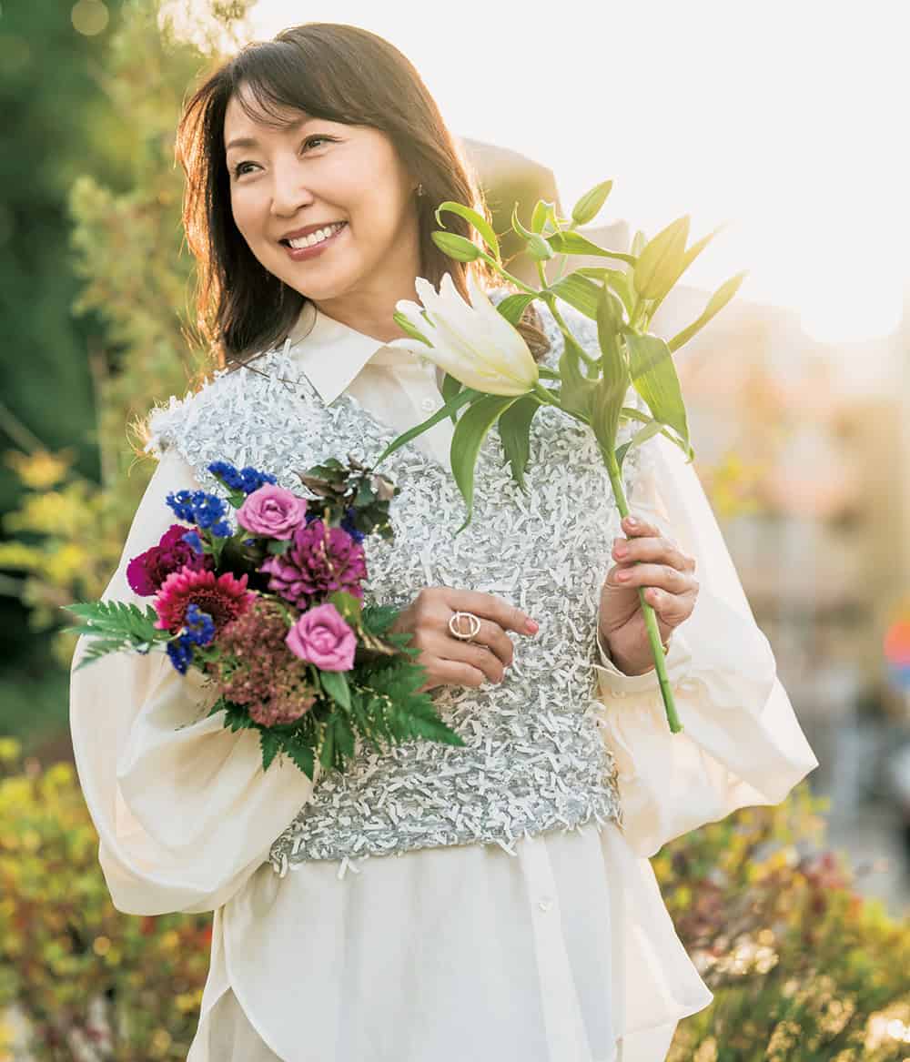 ブラウス¥44,000パンツ¥44,000(ともにアドーア)ベスト¥19,800(カデュネ/カデュネ プレスルーム)ピアス¥5,500〈ieLS〉リング¥16,500〈YArKA〉(ともにロードス)