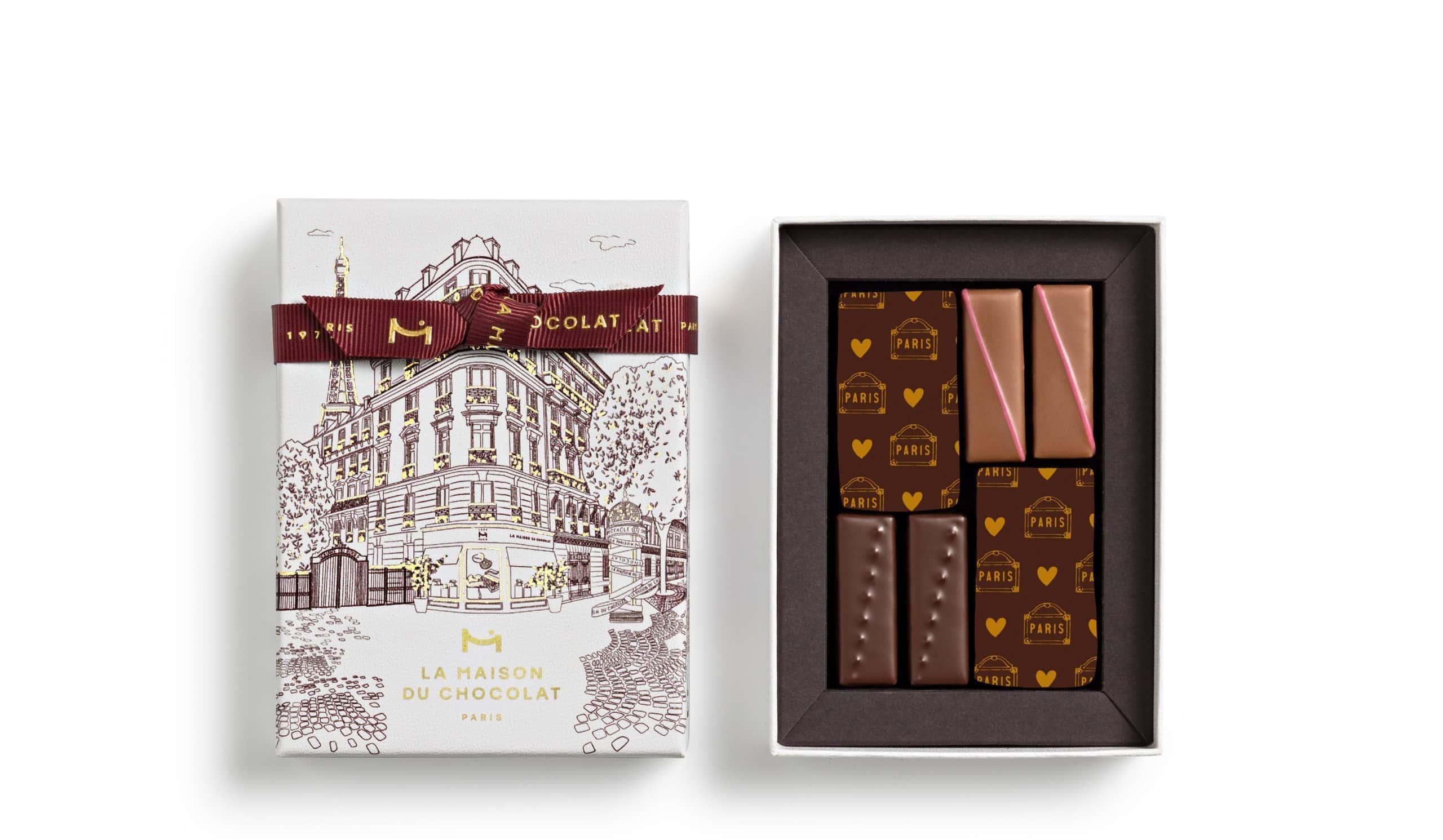 M.O.F.(フランス国家最優秀職人章)称号保持者でシェフ・パティシエ・ショコラティエの二コラ・クロワゾー氏が手がける限定ギフトボックス。パリの本店をオマージュしたコレクションで、パリらしいシックでエレガントな魅⼒を表現しています。限定レシピとして、カカオを贅沢に使⽤したプレーンダークガナッシュの「ガナッシュ ノアール」、ルバーブのピュレを合わせたダークガナッシュをミルクチョコレートでコーティングした「フリュイテ ルバーブ」、マダガスカル産ブルボンバニラにマラバルペッパーのアクセントを効かせたプラリネのブシェ「エピセ ヴァニーユ ポワーヴル」の3種がラインナップ。アーティストのクララ・パヌティエ氏による本店ファザードのイラストも上品で素敵です。