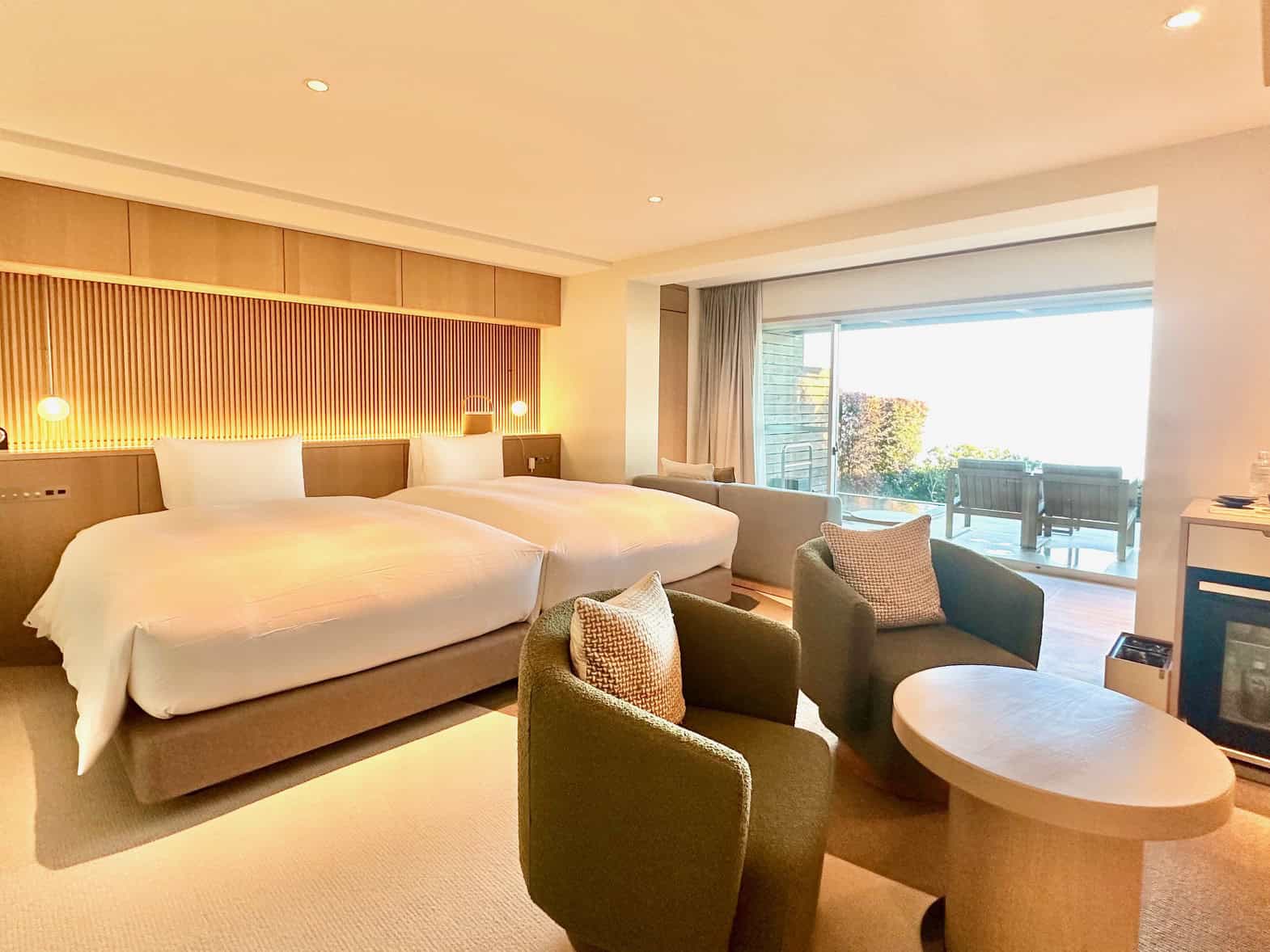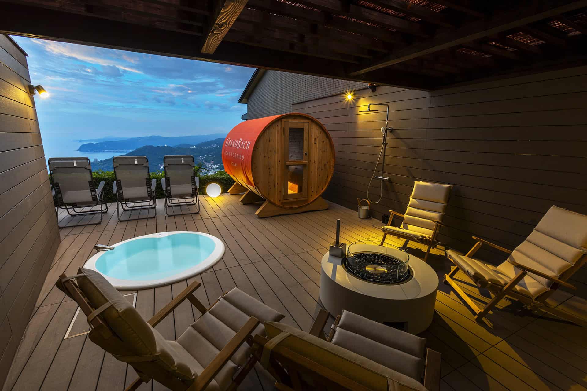 客室で施術を受けたい方は「グランバッハ・デラックスツイン」の予約がお勧め。海を一望できる空間にベッドを2台設置することができるので、母娘や夫婦、友人とリラックスしながら利用できます。こちらの客室は露天風呂がジェットバスになっているので、施術前に血液の循環を良くしておくとさらに効果的です。