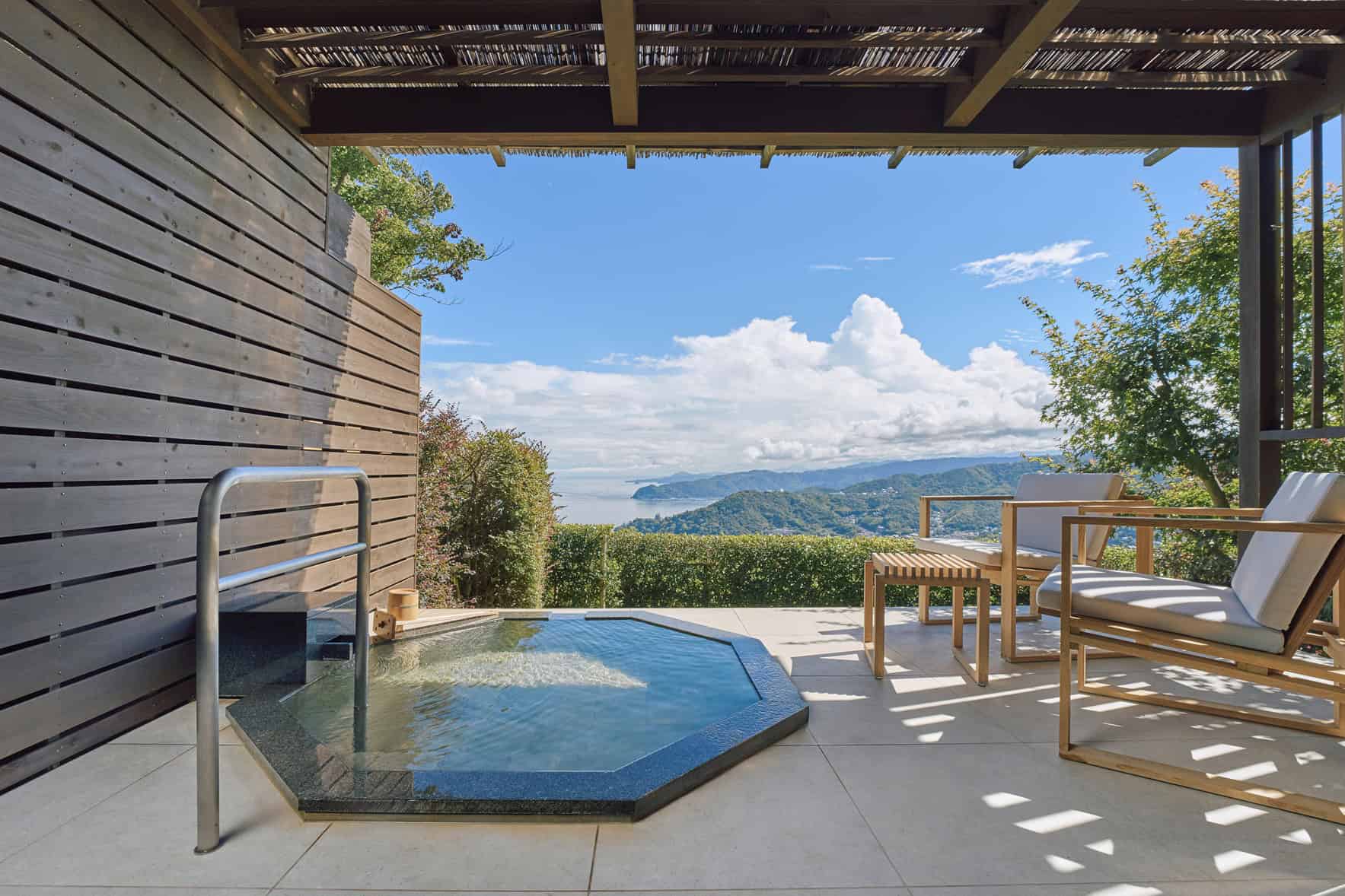 全室が相模湾を望む客室は、わずか16室のみの落ち着いた空間。2階は内風呂から景色を楽しめるビューバス付、1階は自然への没入感を楽しめる露天風呂付の客室で、24時間掛け流しの温泉にいつでも浸かることが叶います。代謝を良くし、筋肉をやわらげるほか、保温効果が高く冷え性にも効果的な美肌の湯。昼は海を眺めながら、夜は星空を見上げながら、滞在中何度も入りたくなります。