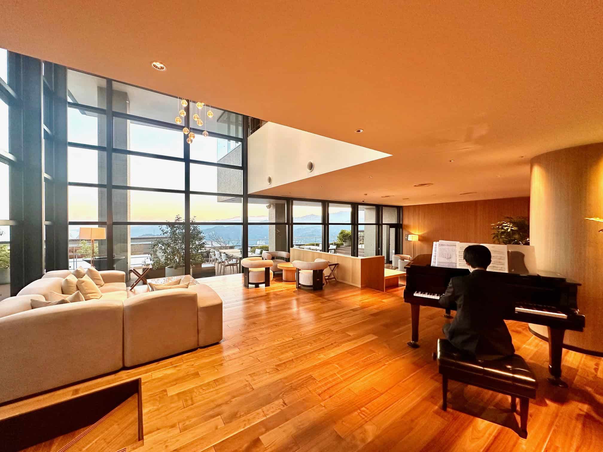 エントランスを抜けると「森の中の音楽ホール」をイメージしたロビーでピアノの生演奏が流れており、ドリンクをいただきながらチェックイン。音楽と同時に、ピアノやバイオリンなどの楽器に使われるアカエゾマツの香りがロビーに広がり、早くも心癒されるひとときが訪れます。